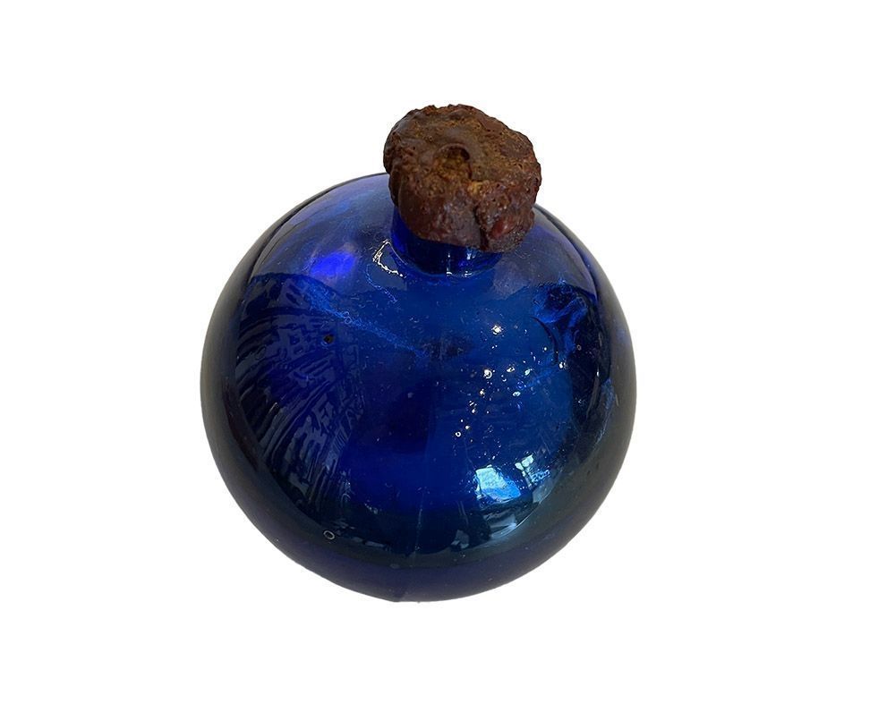 Circular blue glass globe, sealed with wax over an alloy stopper and filled with liquid.Context