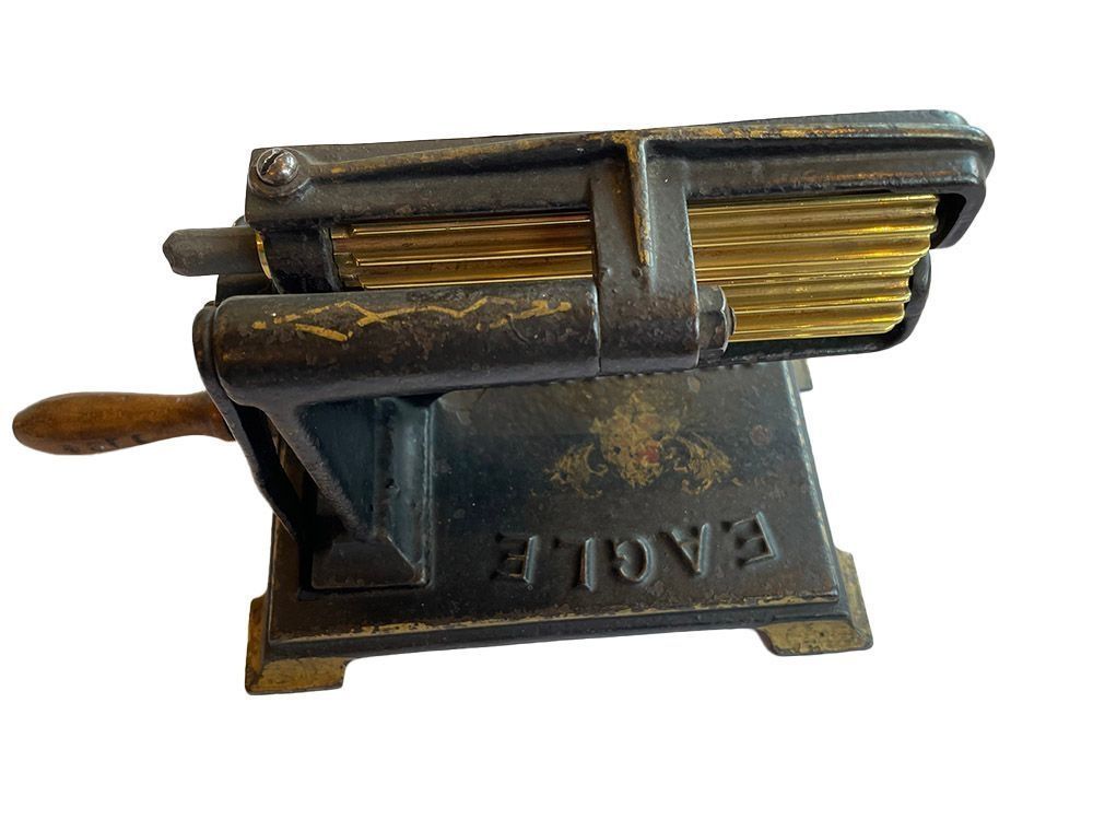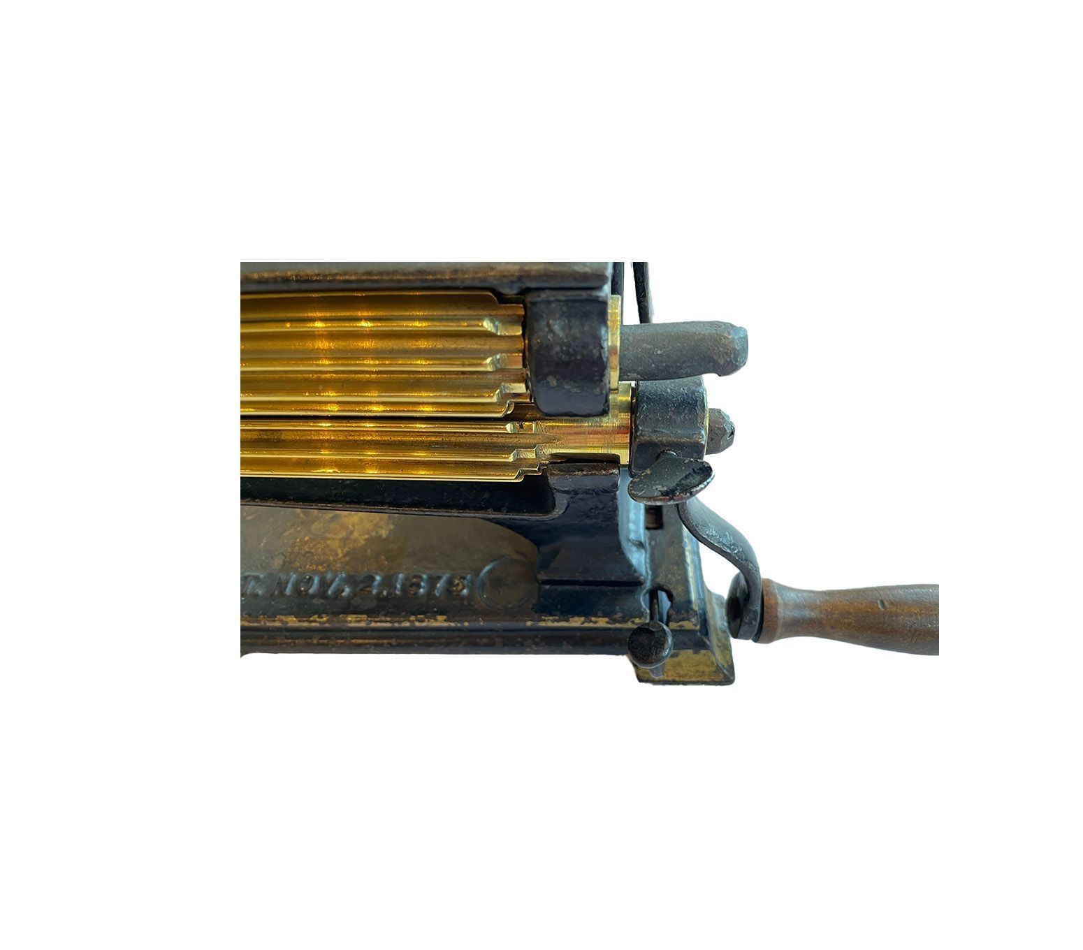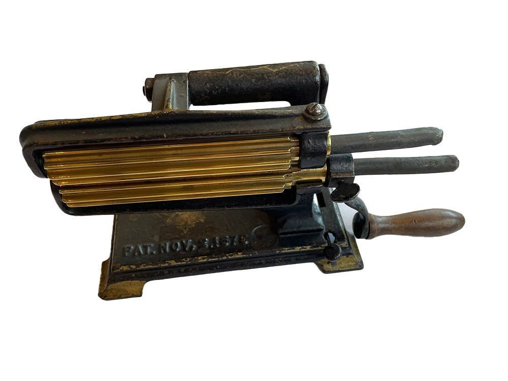 Brass corrugated rollers for crimping hair, with wooden handle and locking mechansim. Two metal rods were heated and inserted inside each brass roller.Cataloged By