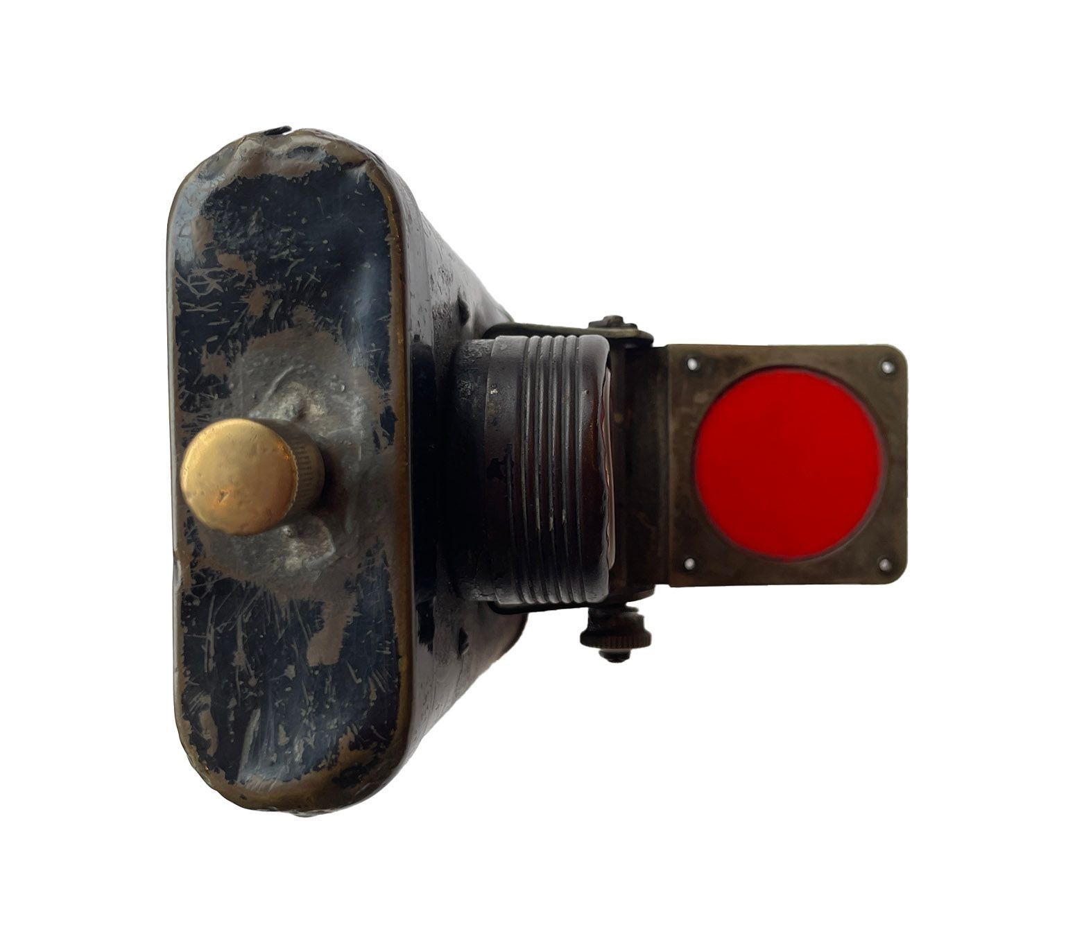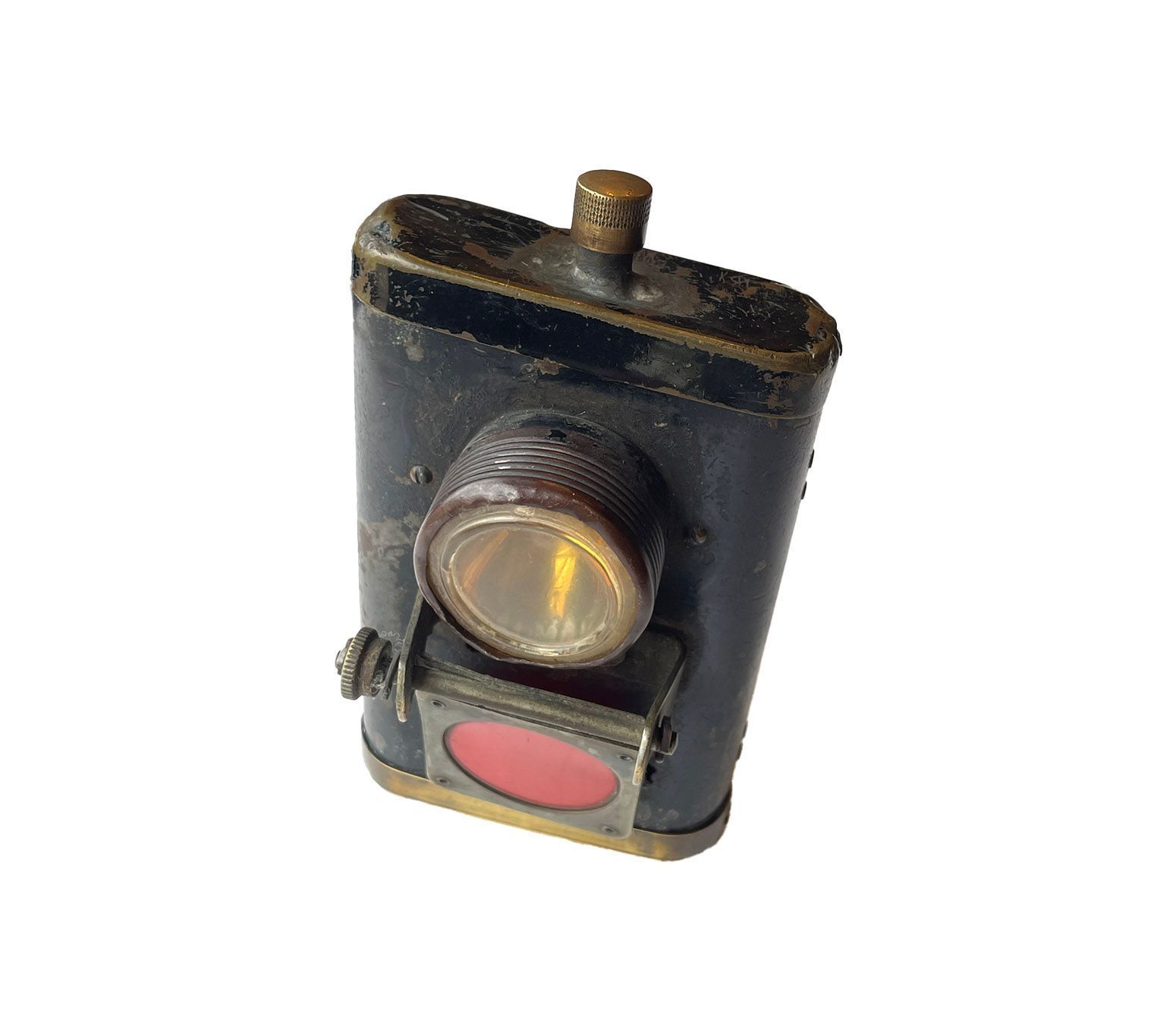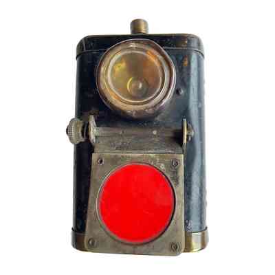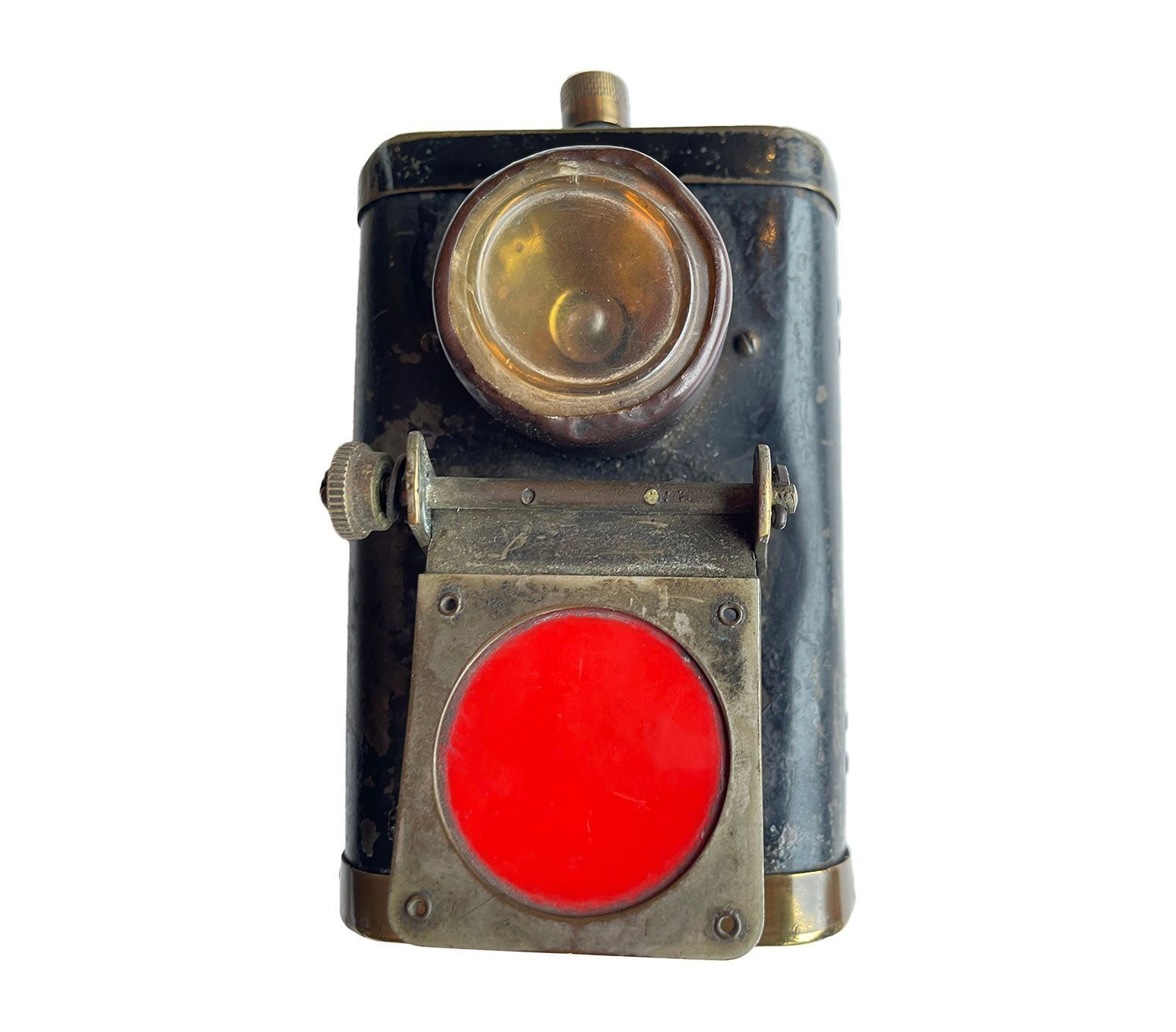 A rectangular metal lamp, with a handles and a clip to attach to the front of a bike. There is a brass on/off switch on the top and a mechanical knob to turn up a red glass to cover the lens. The detachable top and bottom work are held in place by push-in pins that then pop out and lock the pieces in place. Possibly WW1.Context