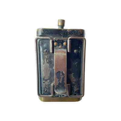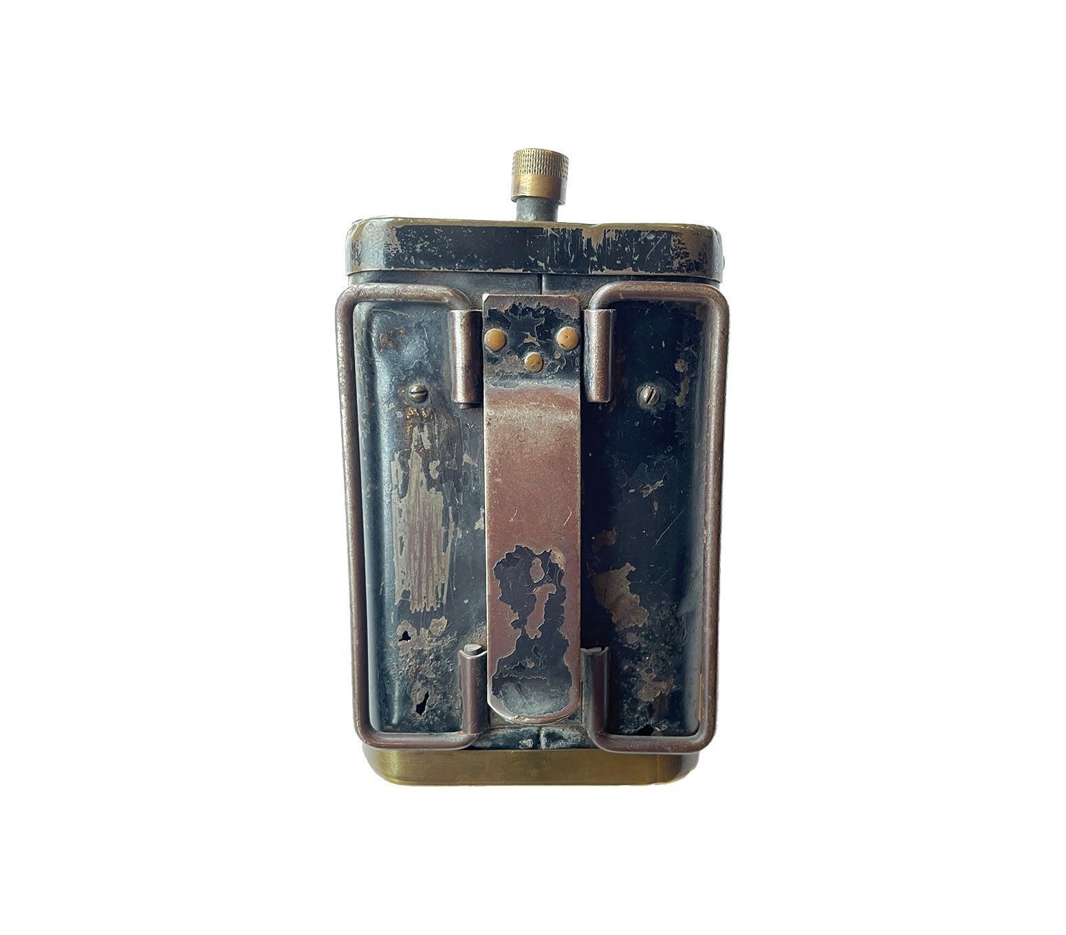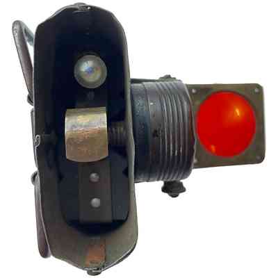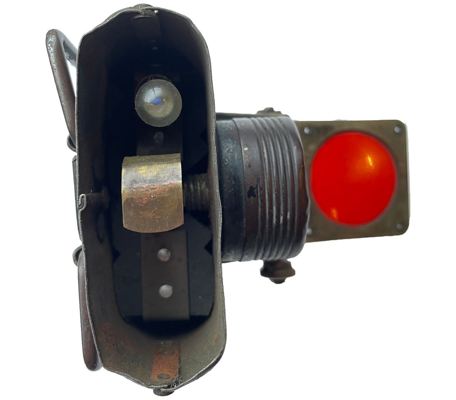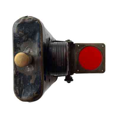 A rectangular metal lamp, with a handles and a clip to attach to the front of a bike. There is a brass on/off switch on the top and a mechanical knob to turn up a red glass to cover the lens. The detachable top and bottom work are held in place by push-in pins that then pop out and lock the pieces in place. Possibly WW1.Context