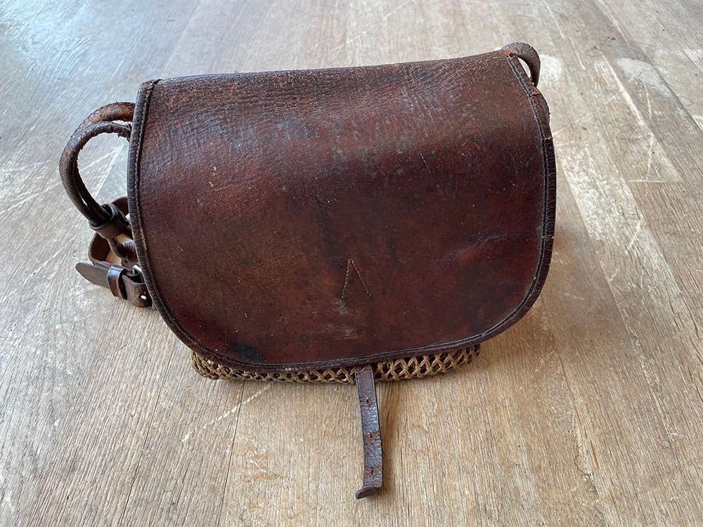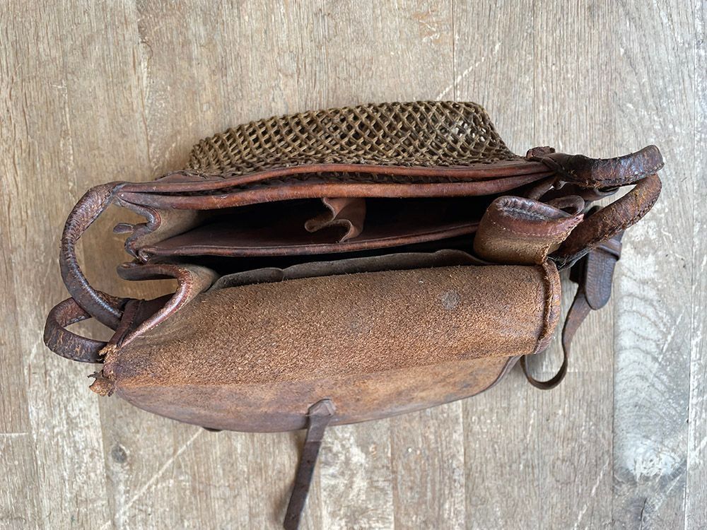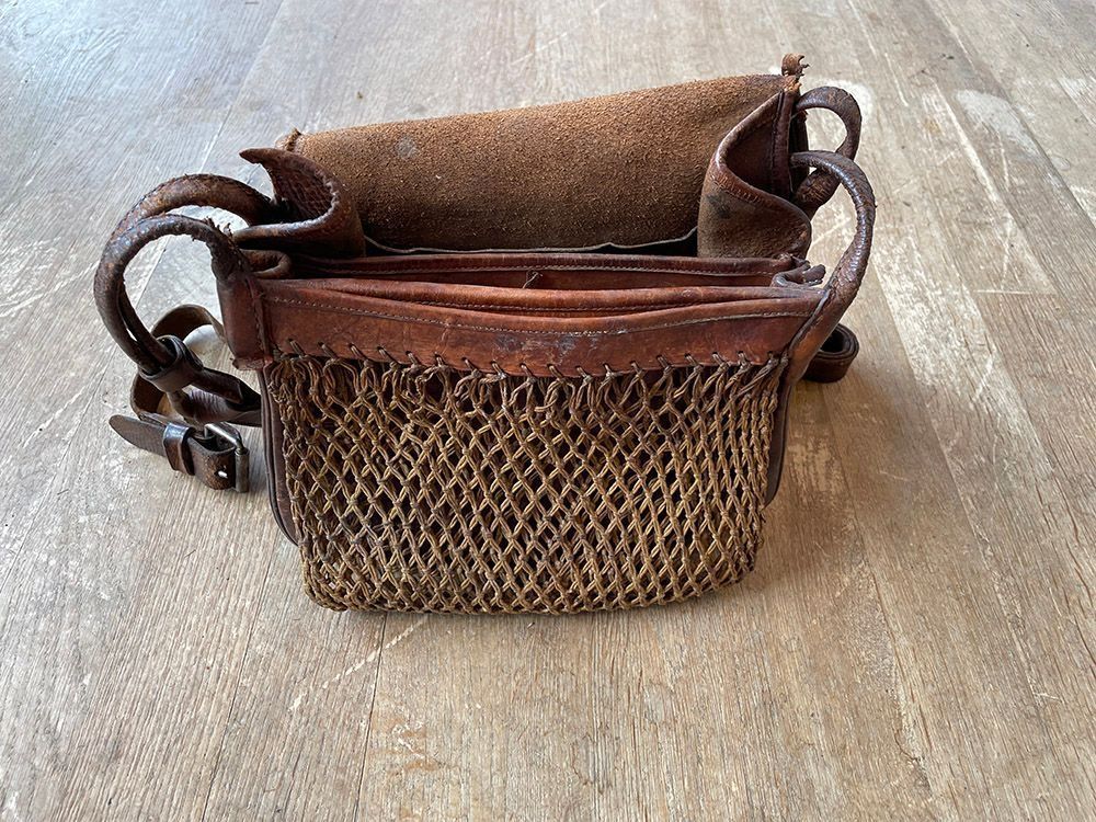 Leather bag with multiple pockets and a game net (string).Context
