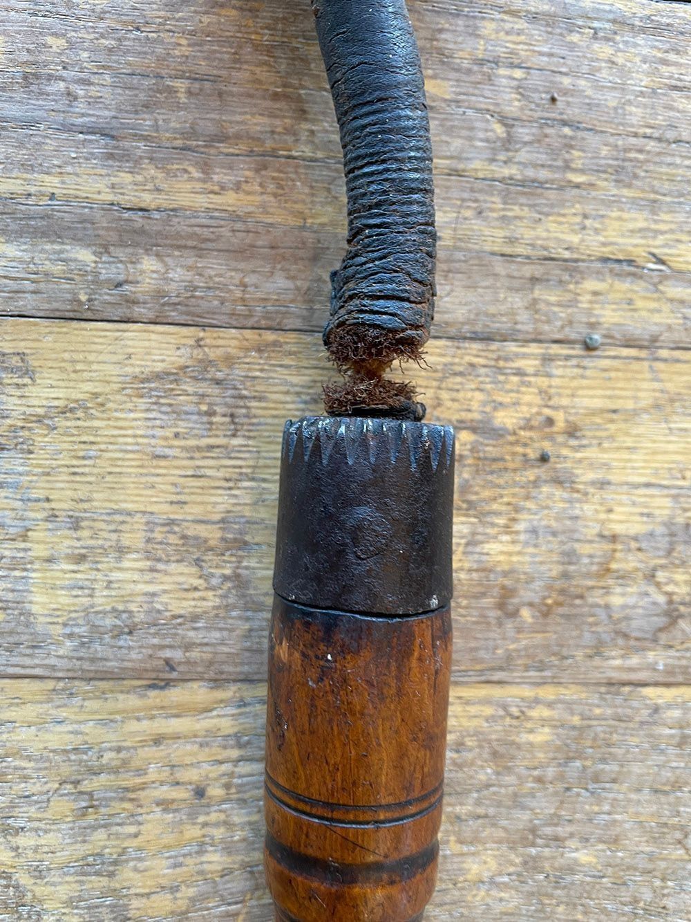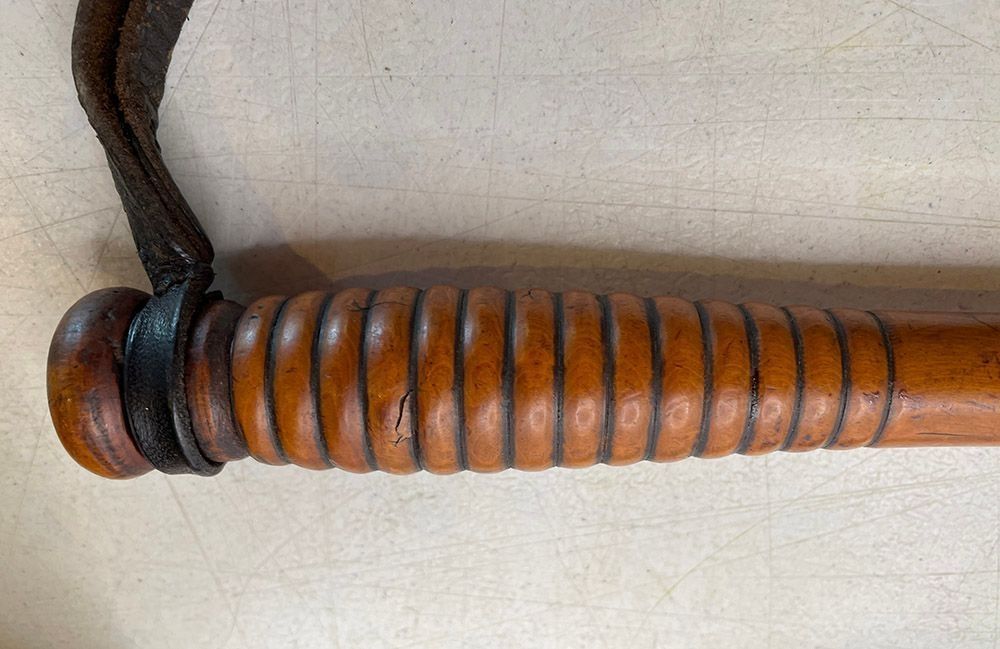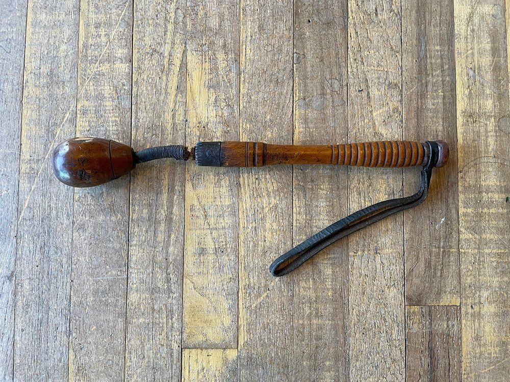 A wooden instrument with a leather wrist band from the handle, at one end and a heavy oval wooden ball on a leather covered rope at the other. The junction between the rope and the handle has a metal clasp. The wooden handle often carved from fruitwood.Context