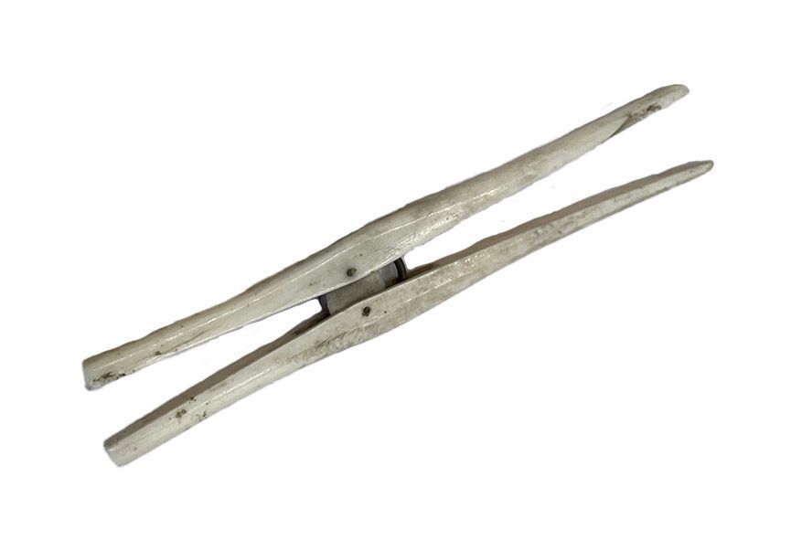 Glove stretcher. The rounded tips were inserted into the fingers of a glove and then the two handles squeezed together, so that the tips opened up. Most commonly they were made of wood, this pair however, is made of bone.Context