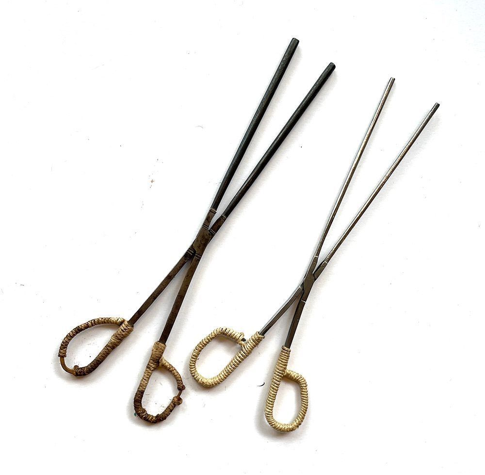 Two pairs of metal curling tongs. The tongs are two straight rods, with string bound round the handles. The tongs would have been heated over a fire or gas burner, tested on a piece of paper to ensure they were not too hot and the hair wrapped around them to make waves or curls.Context