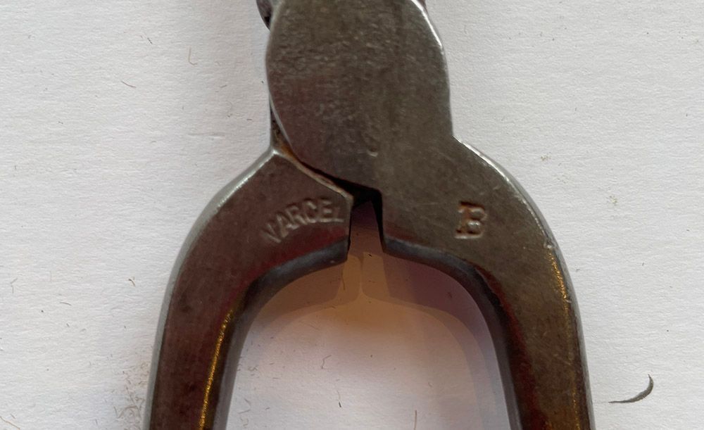 Iron curling tongs - stamped 'Varcel B'. The tongs were placed either in a fire, on a hot iron surface or over a gas burner such as a stove, to heat up. When hot they were tested on a piece of paper to make sure they were not too hot and then applied to the hair to make the curls or waves..Context