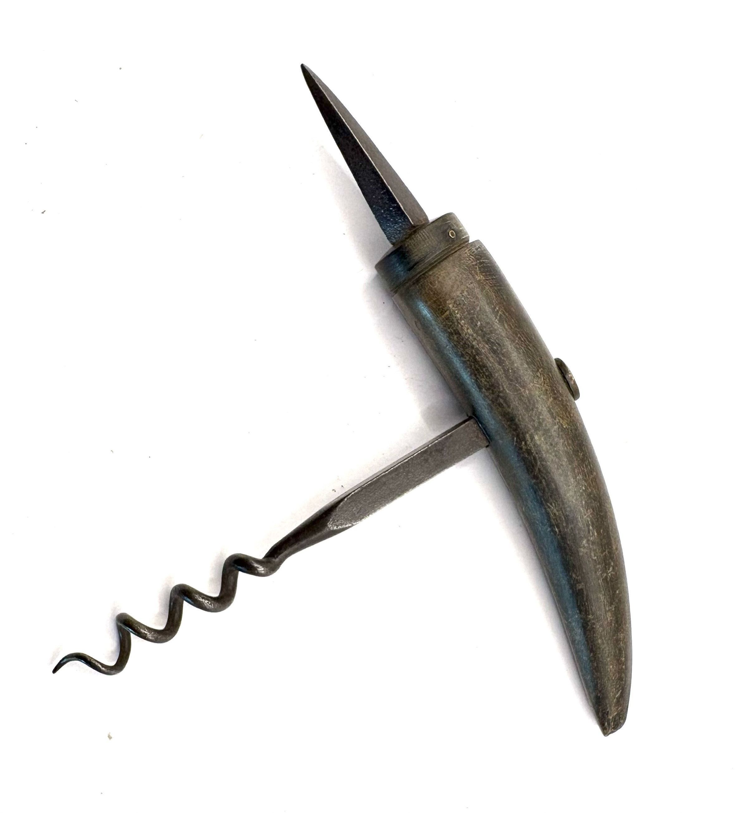 A Victorian direct pull corkscrew with a black cow horn handle. The end of the handle carries it’s original wax removing spike which is surrounded by a nickel silver collar. The original length steel worm remains sharp and is 4.5cms lAcquisition