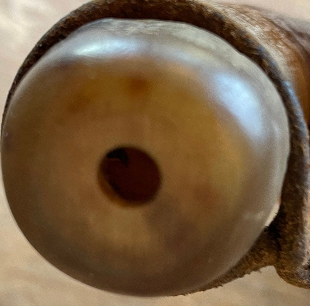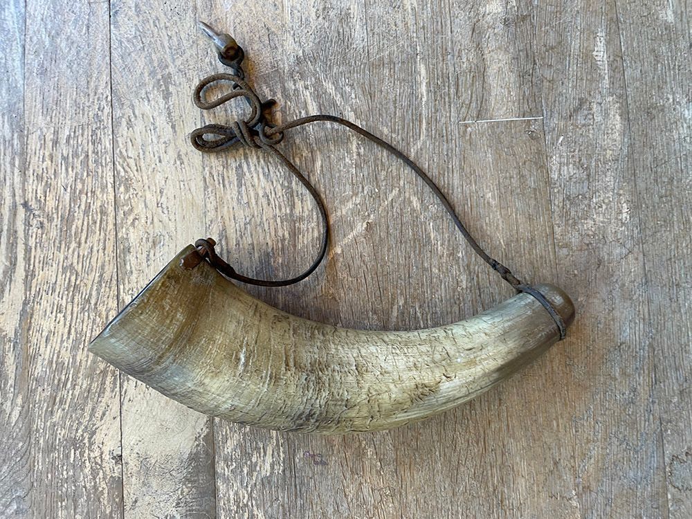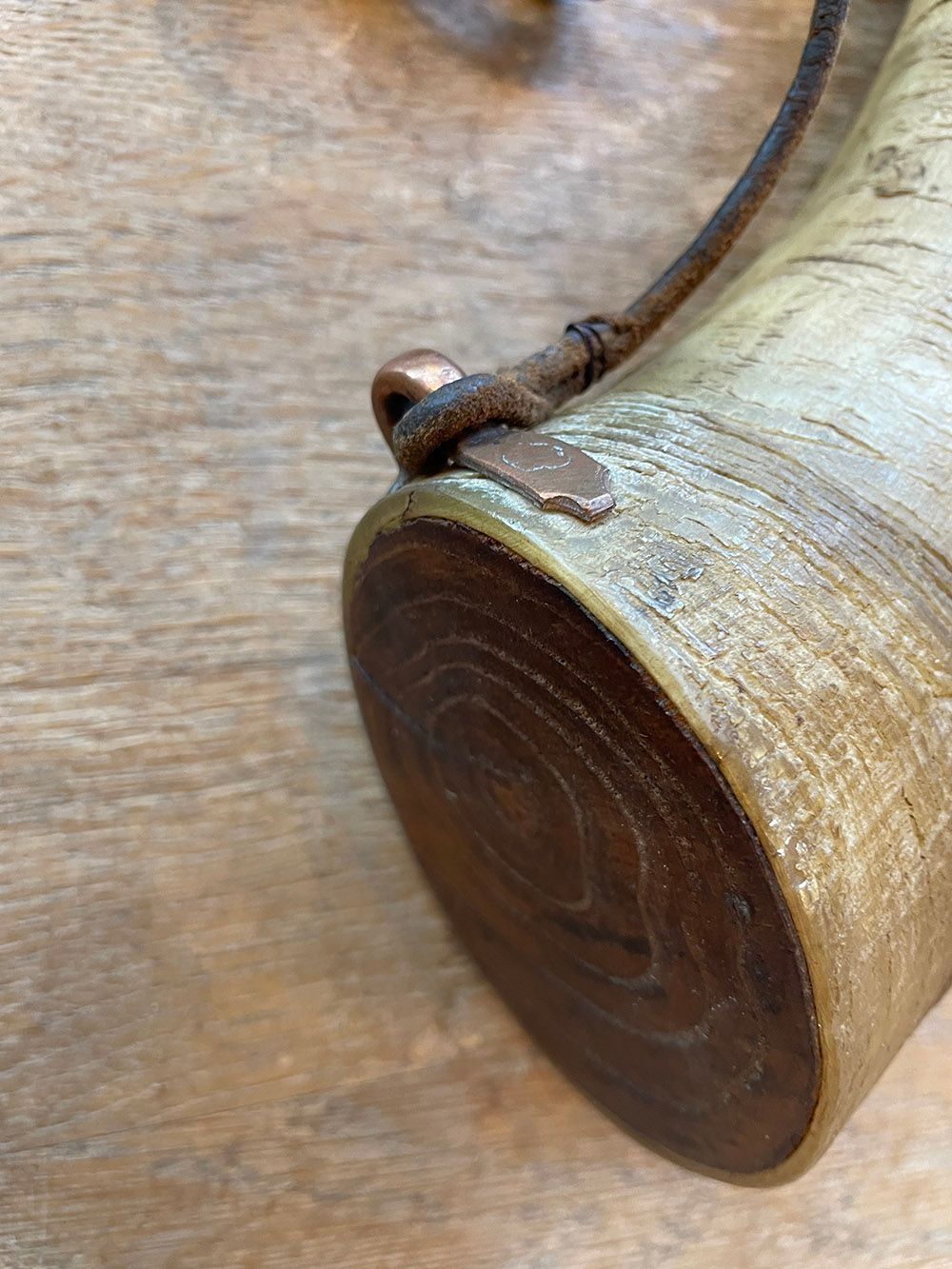 Large horn powder flask with attached leather lace for placing over the shoulder of the huntsman. The fixing for the leather thong is brass. The end of the flask is sealed with a wooden plug.Cataloged By