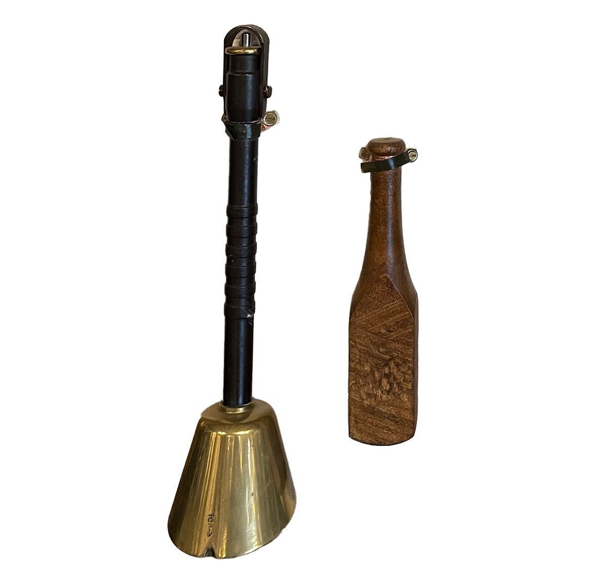 The brass 'bell' rests against the horses head and the bat is used to depress the button at the top of the gun to eject the bullet - it is possible to see the marks of the impact from use on the bat.Category