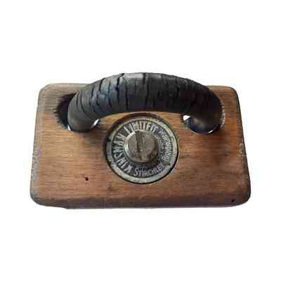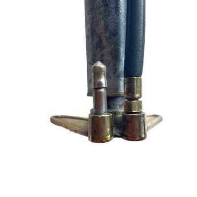 A tyre pump specifically made for motor cars. The pump as brass feet, a metal pump, flexible rubber tubing, and at the top a wooden rectangle to hold the rubber flex and which also advertises the maker.Context
