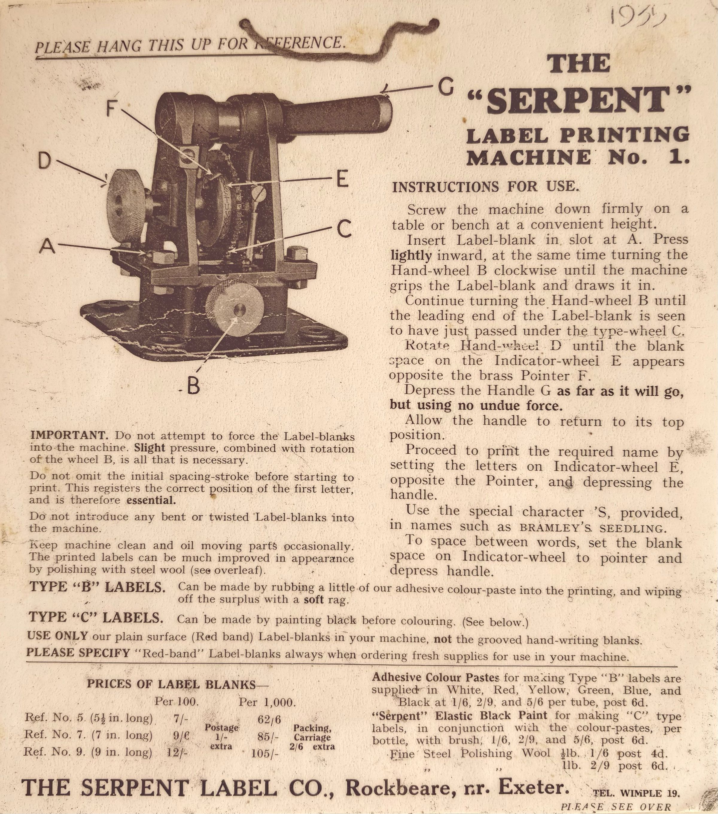 The Serpent labeling machine was marketed by nearly all the big horticultural outlets. The No1 was introduced in about 1930 & by 1940 they had produced the No 3. In 1938 the No 2 model was priced at £3 18shillings. In 1940 the No 3 model was priced at 27 shillings & sixpence so a price drop in two years. The manufacturing company was owned by Captain Hubert Leslie Stringer and was located at Pinecroft Rockbeare Hill Nr. Exeter.Cataloged By