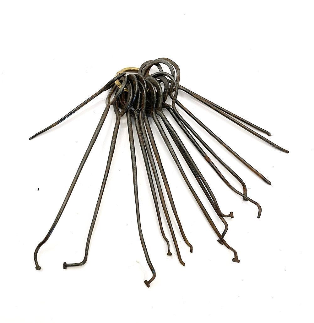 A set of 15 metal Lock picks, held together with a brass clasp.Context