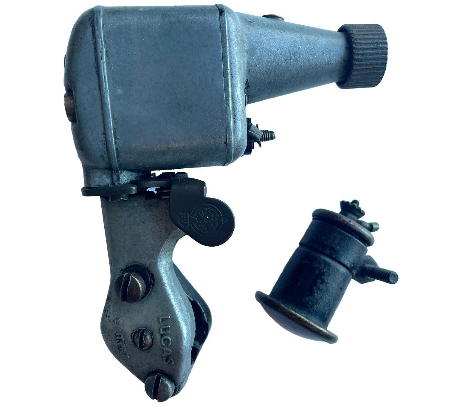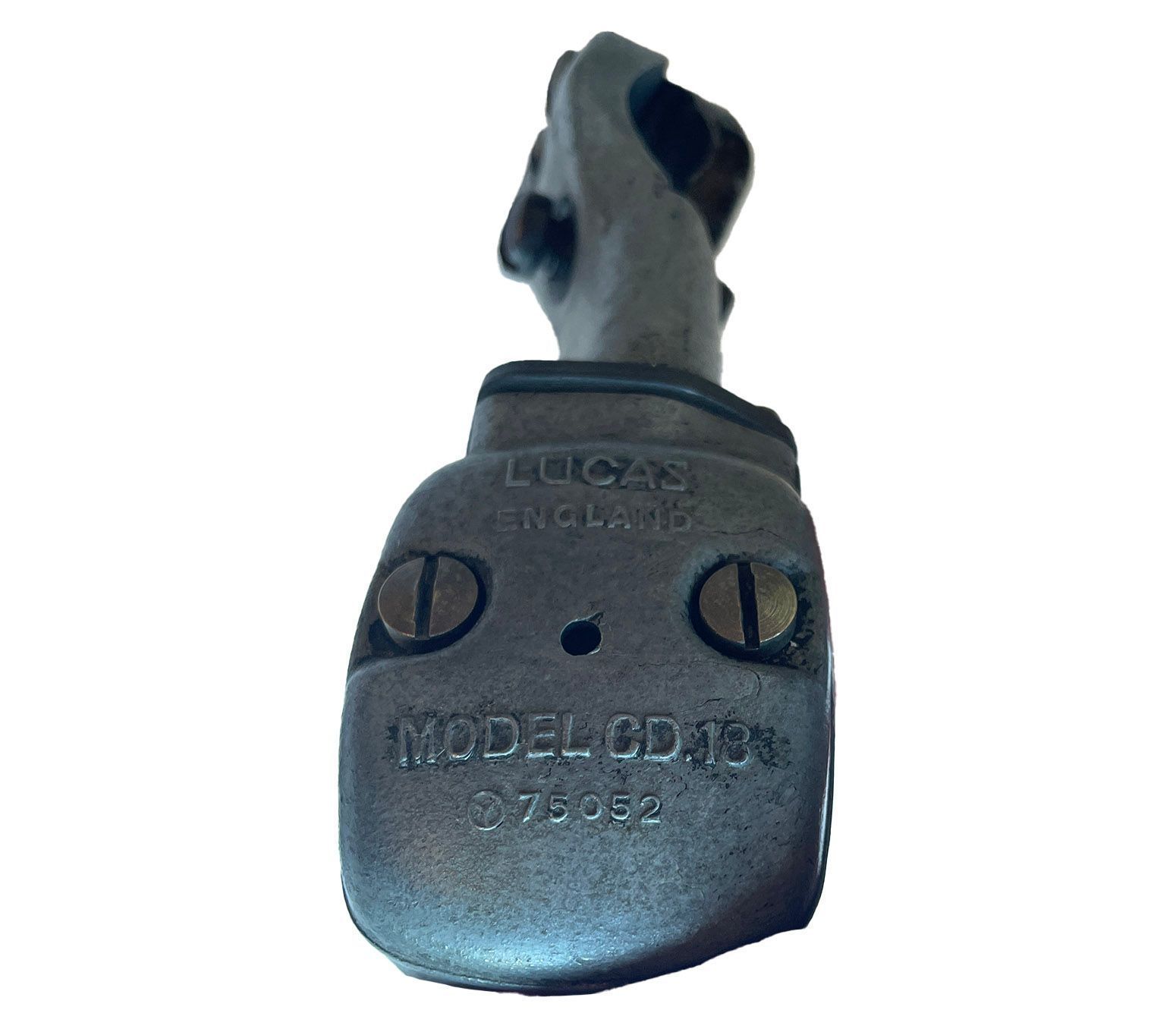 Lucas, the well-known British manufacturer historically associated with automotive and motorcycle lighting, also produced bicycle dynamos like this Model CD 18; 75052. Above the clasp on the side is the no. 750345 and on the circular tab is the well-known Lucas emblem with the wheel, lion and flame.Cataloged By