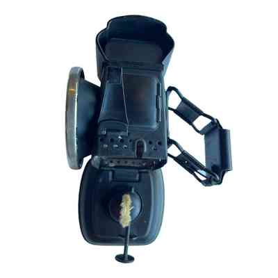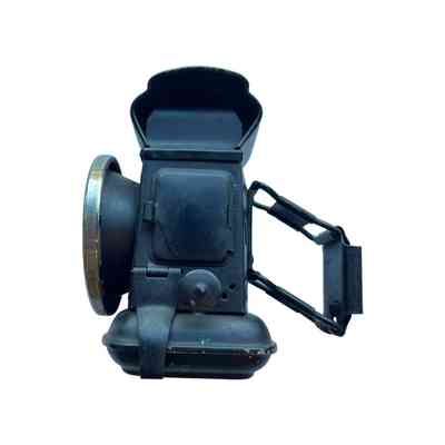 Black metal bicycle lamp, with fuel reservoir and wick. The packaging description says: