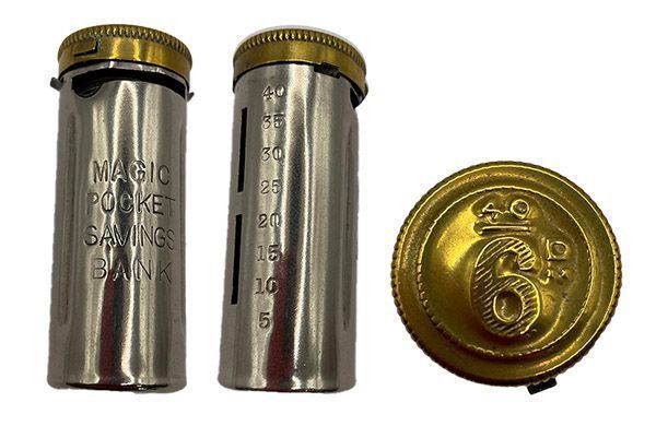 1950s cylindrical metal and brass tube, with slots for coins, indicating the amount saved in increments of five coins.Context