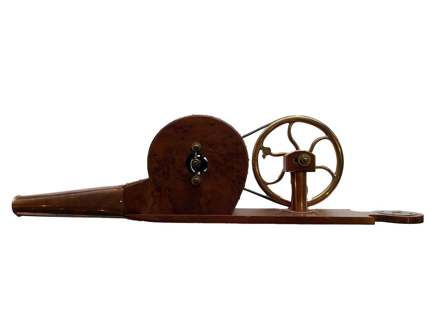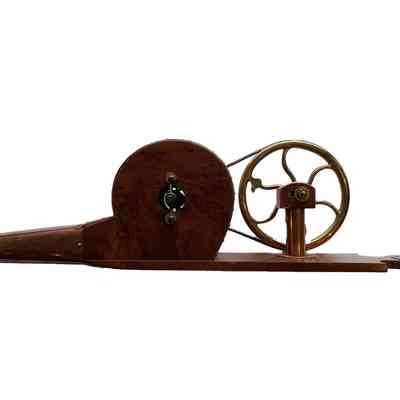 Brass, copper and wood machine to simulate the action of hand-action bellows. The handle is turned which rotates a wheel inside the bellows which pumps air out of the funnel. The bellows are set on a wooden base with a hole for hanging. There is also a possible makers mark 'T. H. Cragild', incised three times in a triangle. The bellows are beautifully crafted with precision and care.Context
