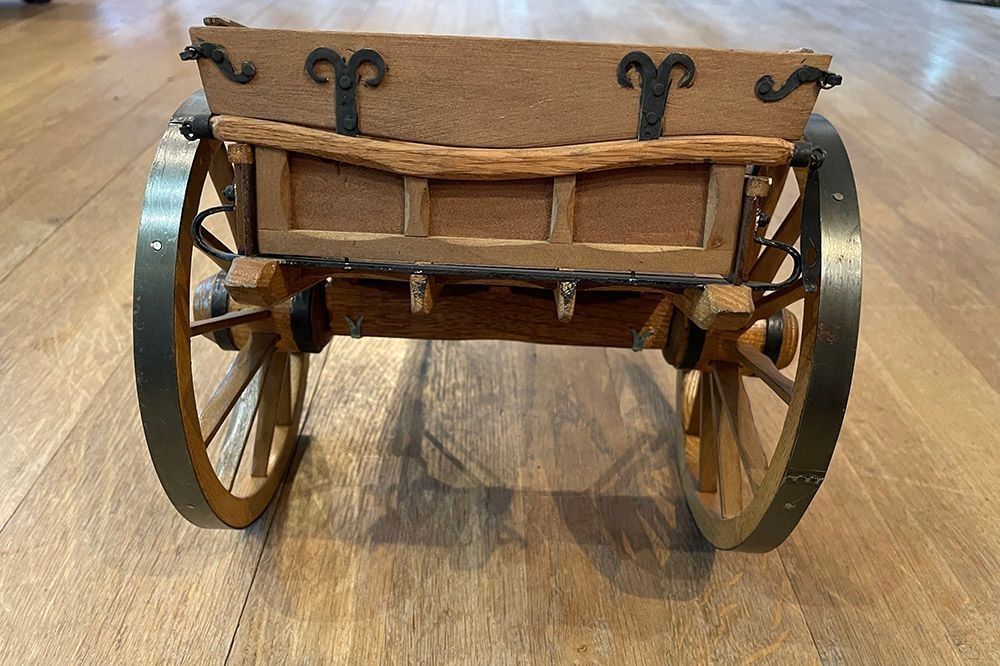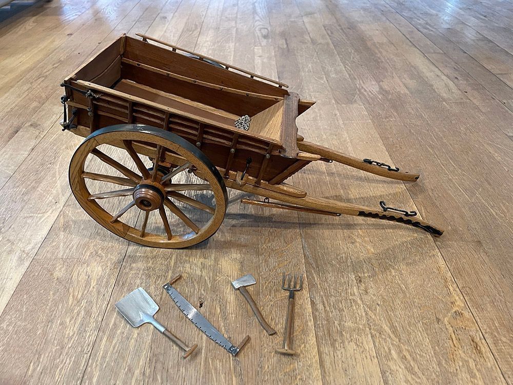 Model of horsedrawn cart with a selection of typical tools of the time. The wheels are constructed of wood with a metal rim. Three different craftsmen were involved in the construction of one cart - the wheelwright to make the wheels, the wainwright to make the body and the blacksmith to make the metal parts. There were two basic styles , the box wagon and the bow wagon. Designs vary from county to county.Context