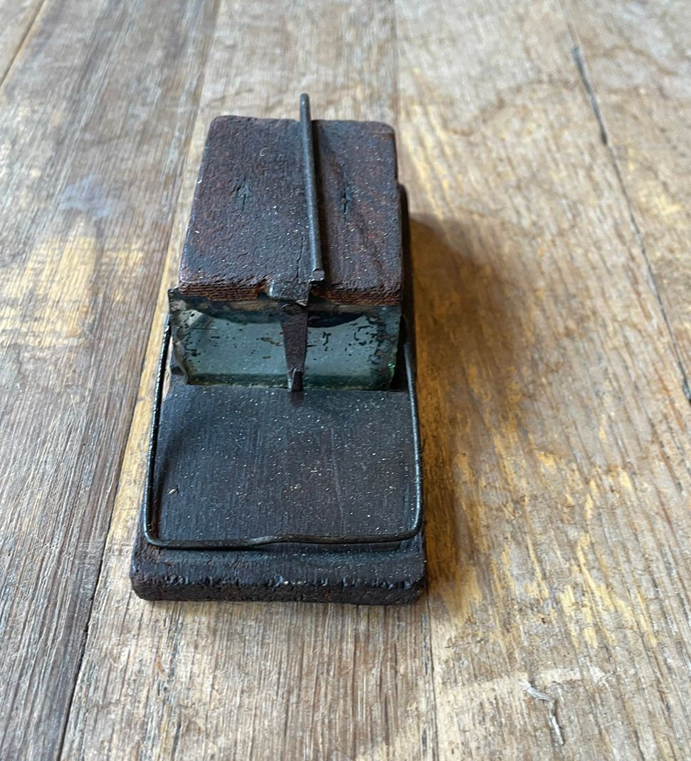 Wood and metal mouse trap, with mirror.Context