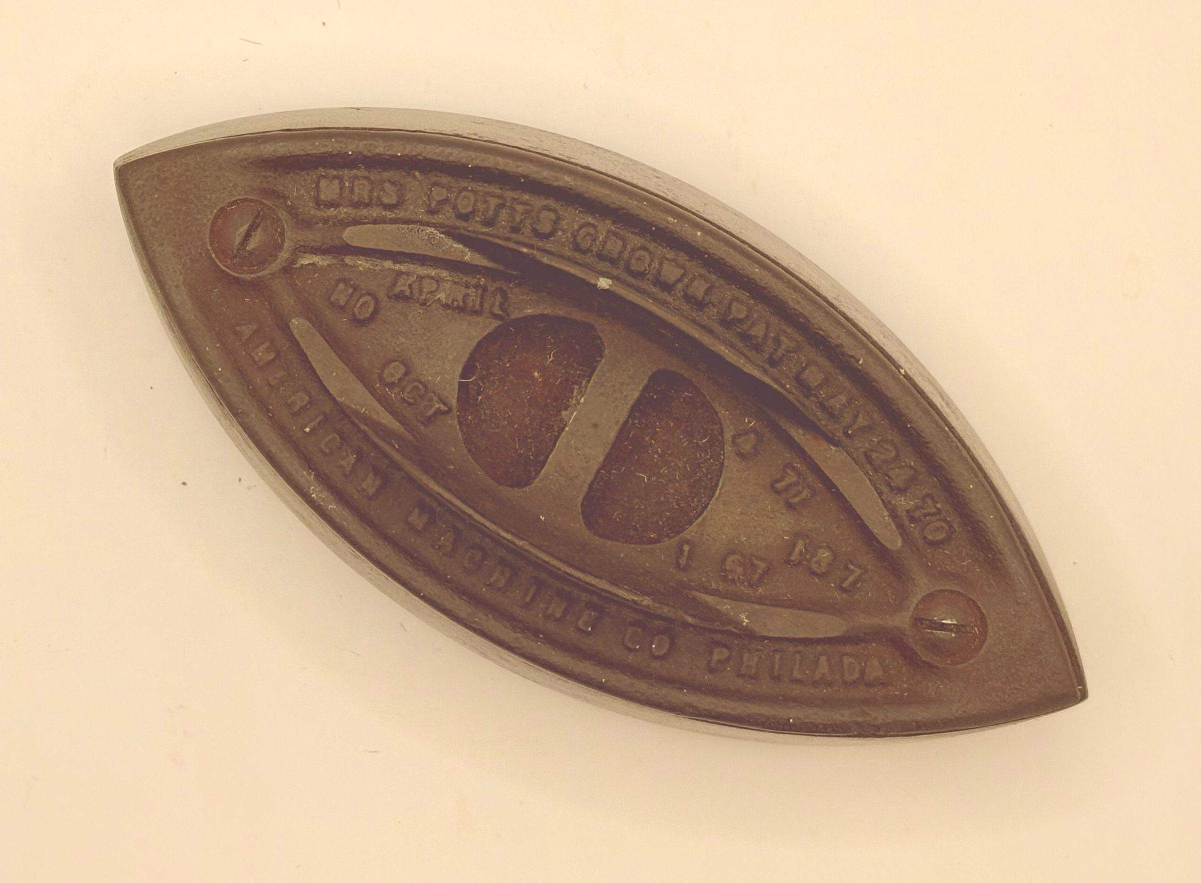 The base of the iron is labelled "Mrs Potts Crown Pat May 24 70 American Machine Co Philadelphia" and the middle is labelled "No 187 April 4 71 Oct 1 67.