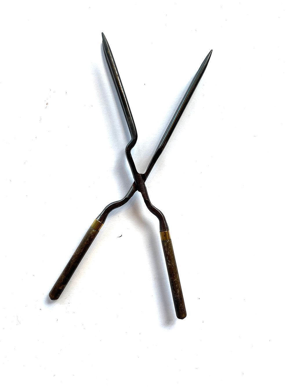 Scissor type tool with multiple prongs - two one side and three the other that interlace when closed. The tongs are made of metal, with wooden handles and a brass band where the two meet.Cataloged By