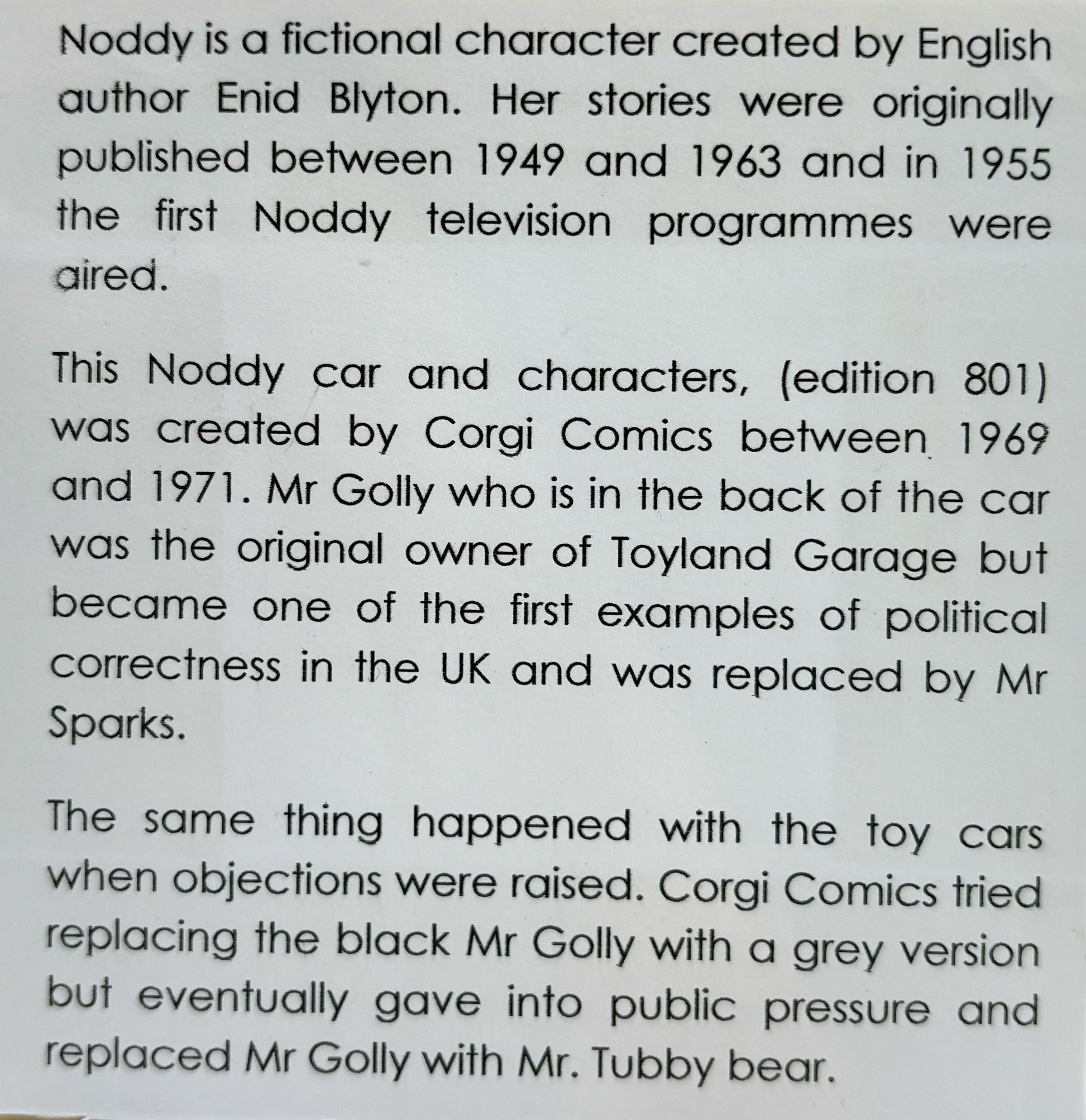 The iconic Corgi Toys #801 Noddy's Car, featuring Noddy, Big Ears, and Golly (often with a black face initially, later changed to grey, pink, or light tan) is a popular die-cast model. The car is typically red and yellow, with balloon tires and chrome trim. The original version included a black-faced Golly, but later versions addressed racial concerns by changing the Golly's skin tone. Later, Golly was replaced by Mr. Tubby.Cataloged By