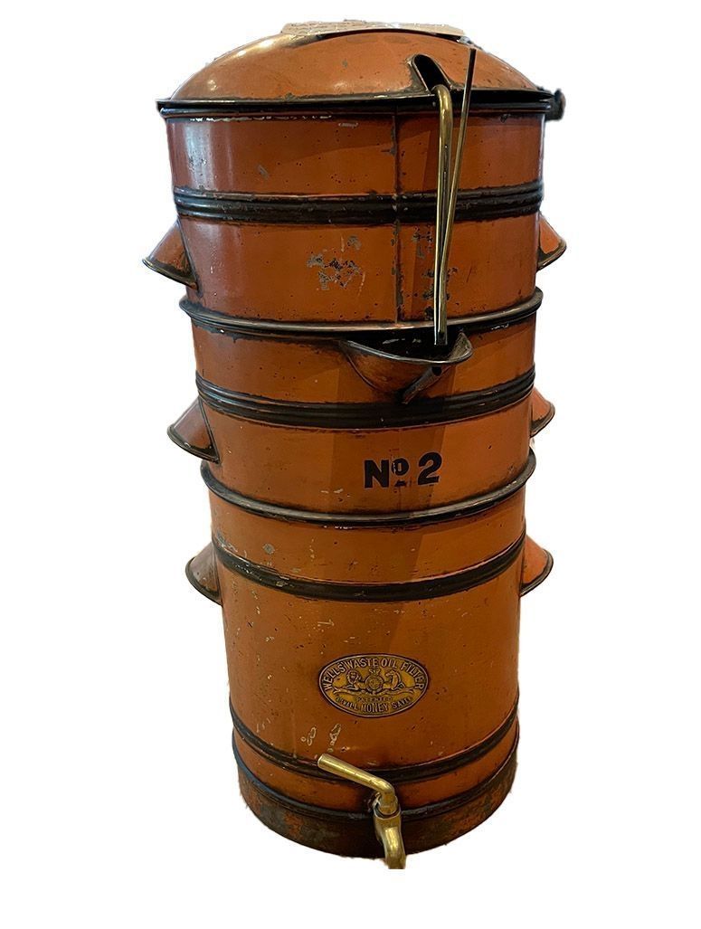 Metal cylinder with three levels (other models have one or two levels). This model has a dispensing tap at the bottom and a flow system at the top. The makers plaques are brass.Context