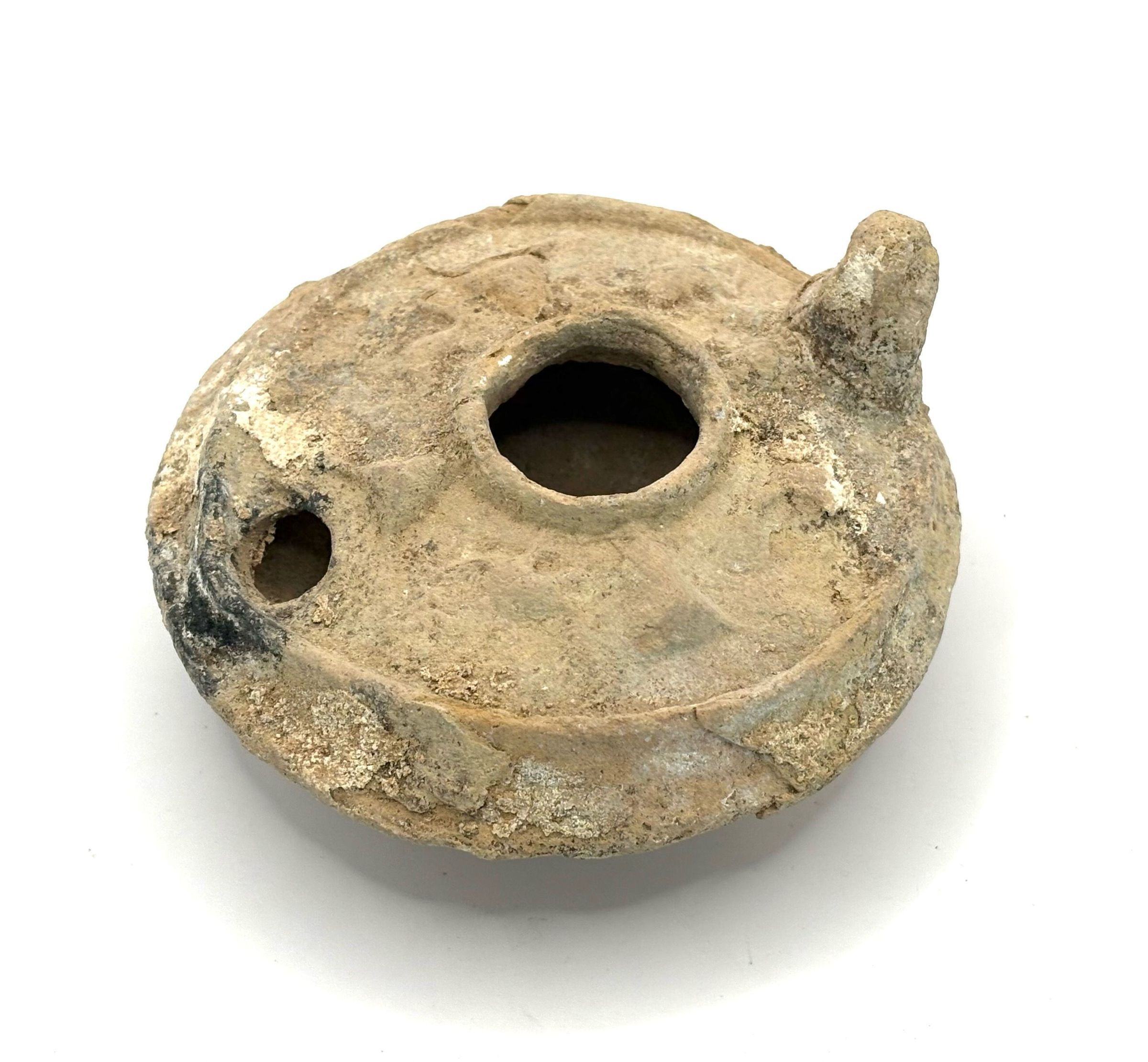 Fawn pottery round Oil Lamp with Lug Handle - Circa 600 AD Believed to be Islamic. Relief design of raised triangles around oil hole, star design within base ring. 95mm 3.7”Cataloged By