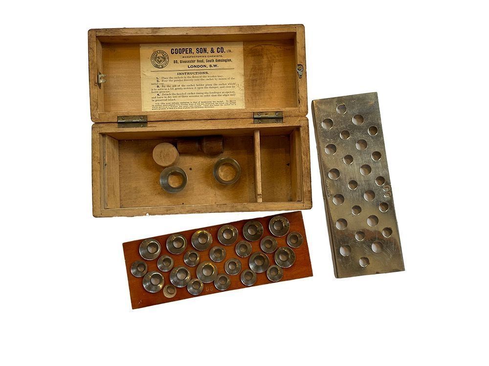 Wooden box containing metal plate with holes and a wooden board with holes for measuring 'cachets' (flutes). the box also has a bottom space for storing rice paper and the damper and cachet holder. On the metal plate the word Pinot is inscribed on one side and 88 on the other.Context