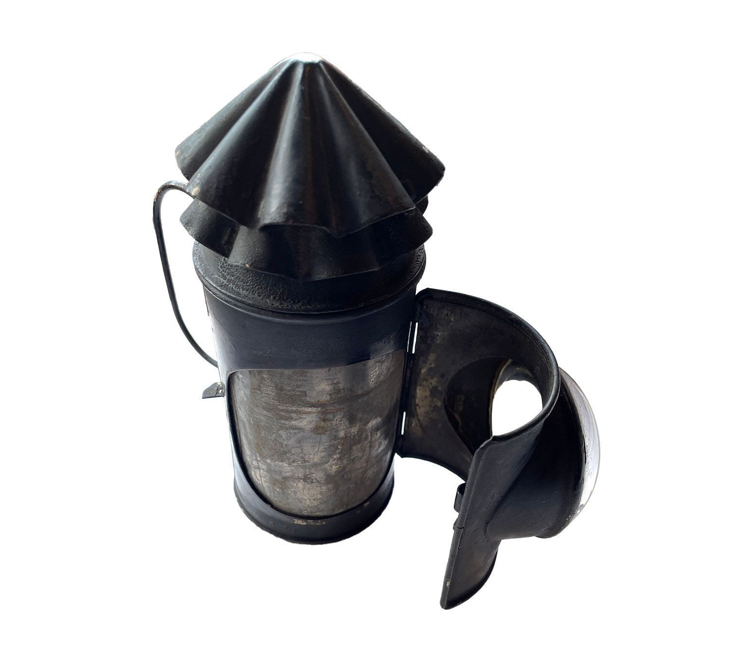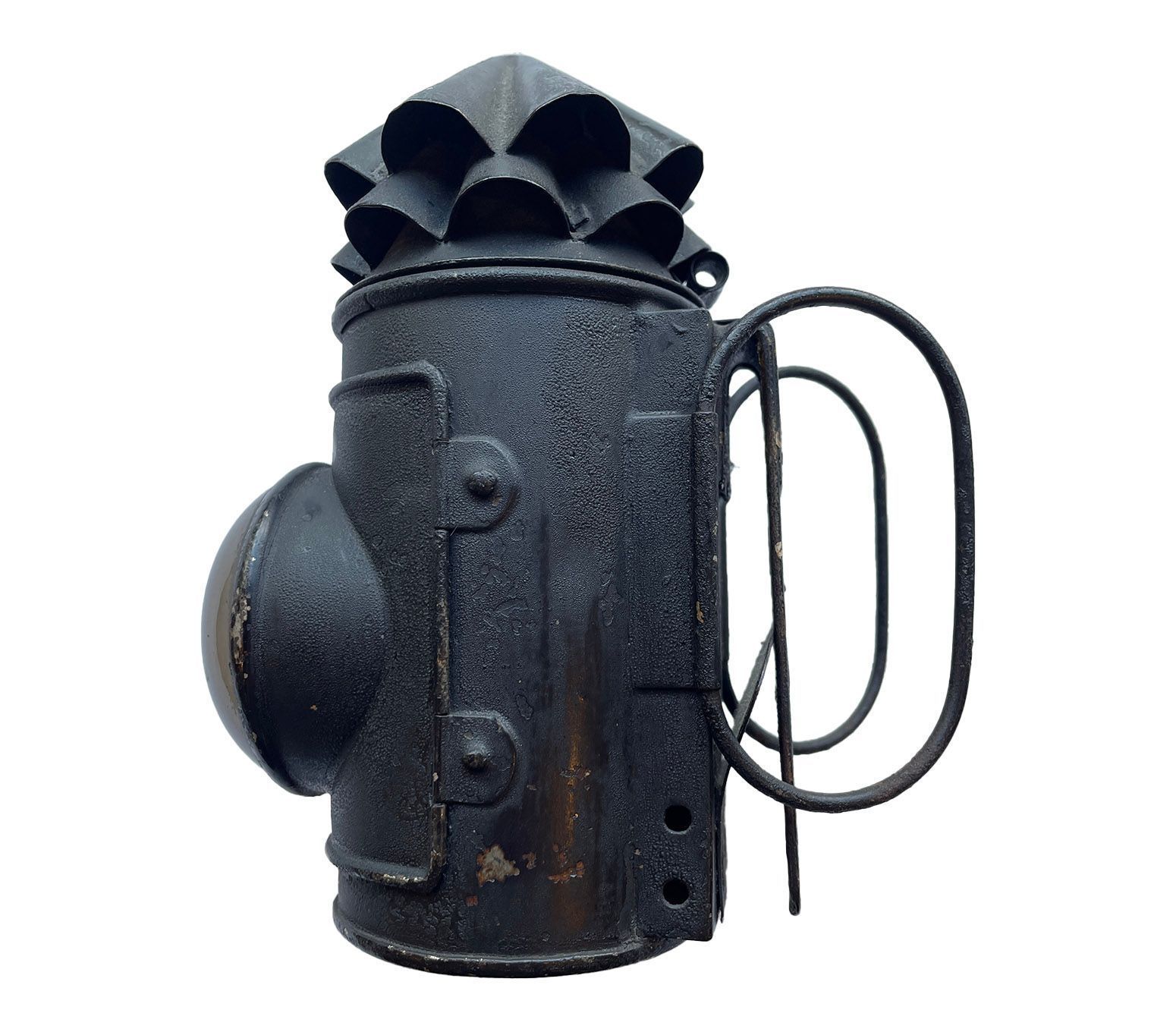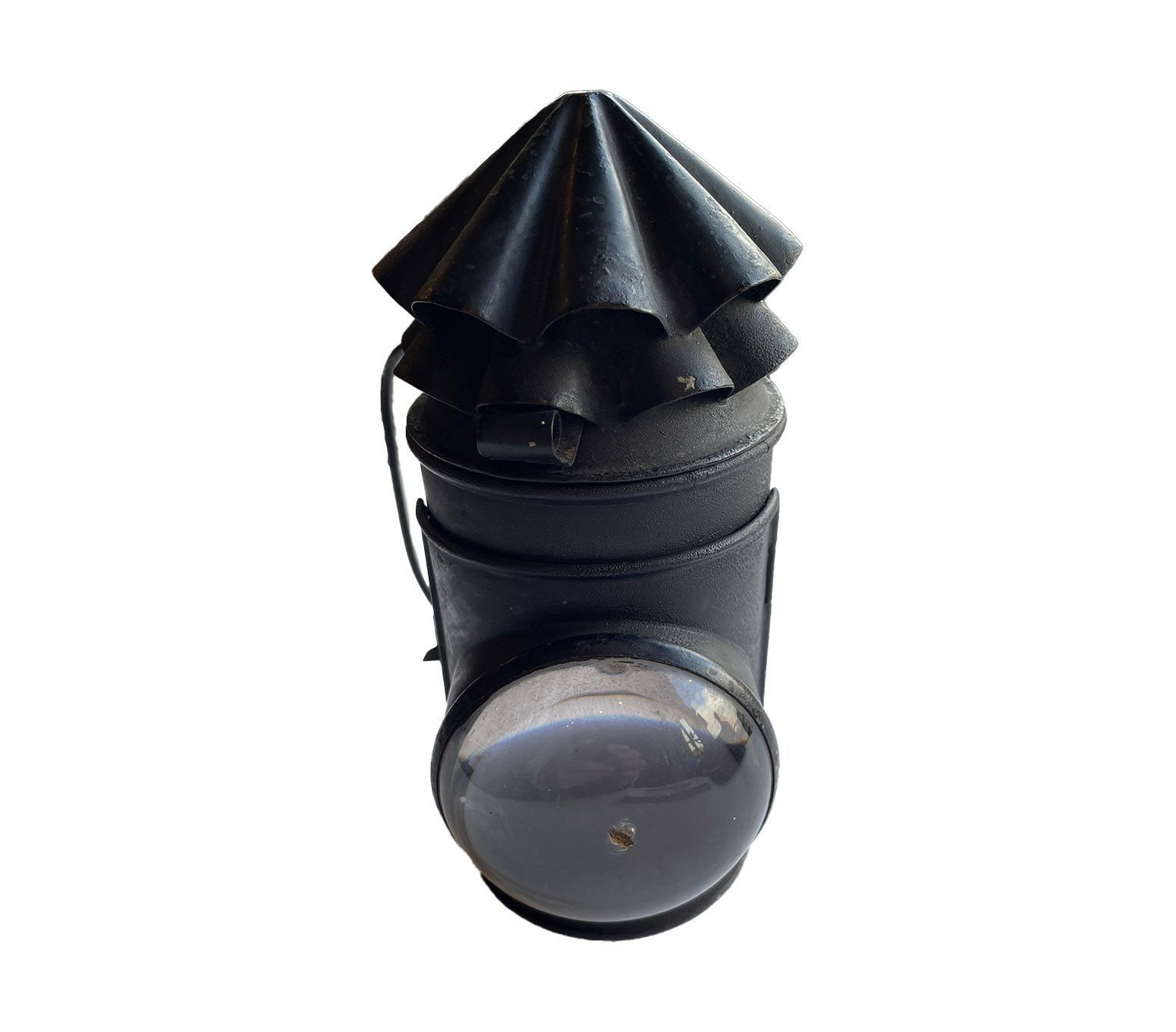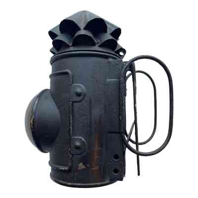Metal cylindrical lamp, with two fluted flues on the top, large spherical lens, handles at back and also a clip to attach to a belt. The lamp also has an internal aluminium shutter, which shuts the light off andis operated by turning the flutes on top of the lamp.Context