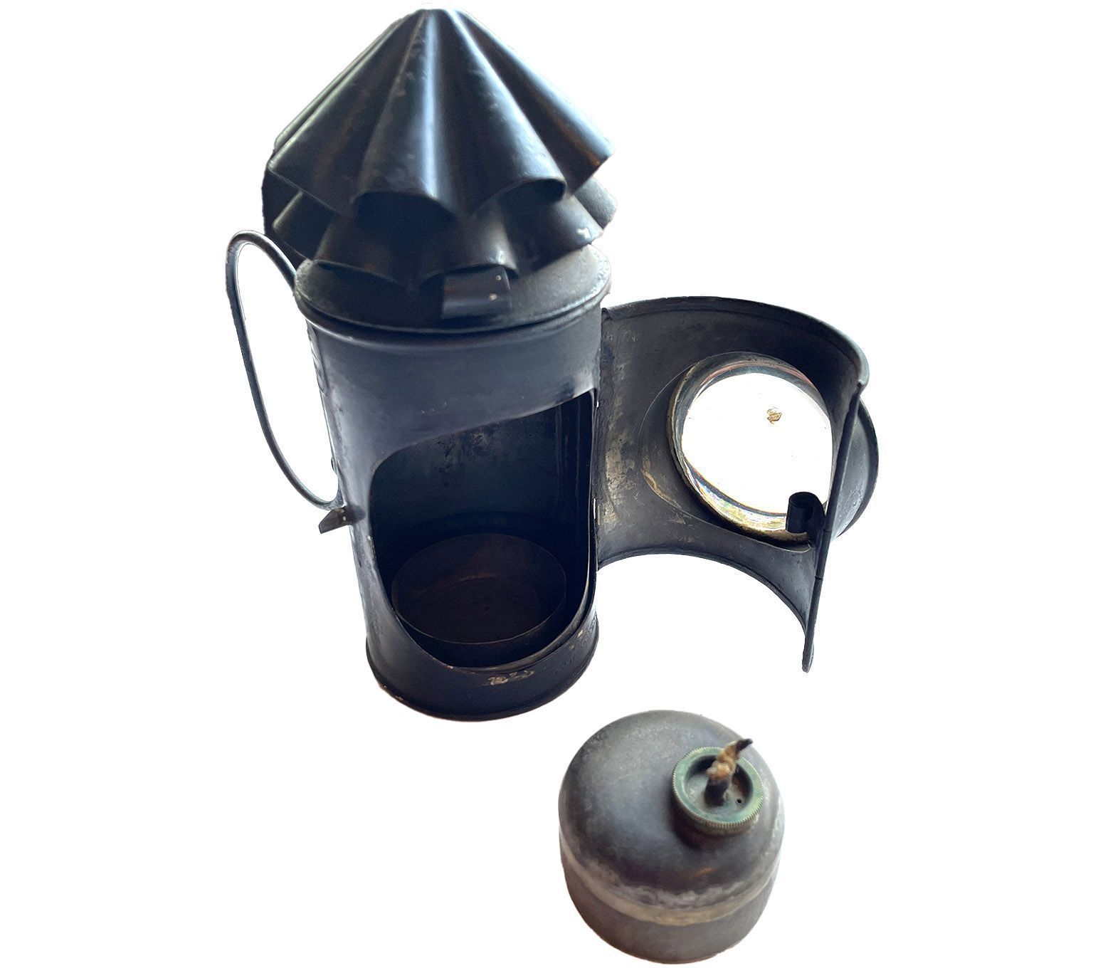The name Dark Lantern refers to the ability to shut the light off with the shutter. Originally light with a candle, it was more convenient to close a shutter than blow out the light. The lantern that Guy Fawkes is supposed to have used when entering the House of Parliament to blow them, is of a very similar design. It is on display at the Ashmolean Museum Oxford but can be seen online: