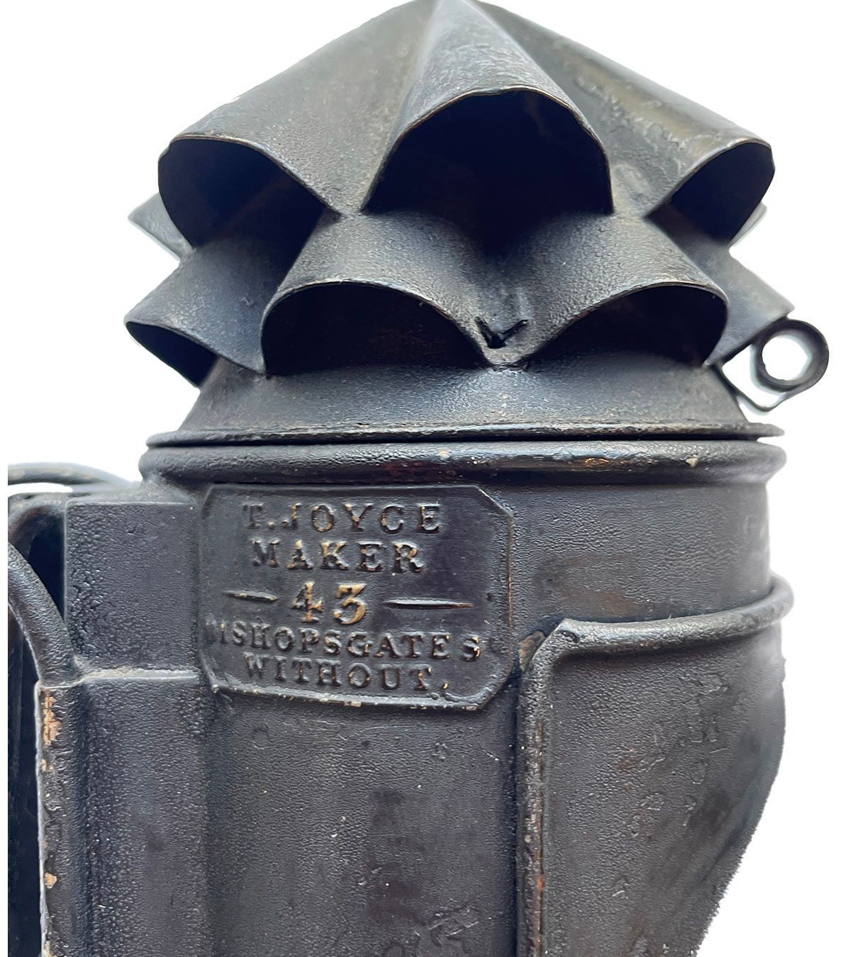 Victorian policeman's lamp c 1890. The lamp was also known as a Dark Lantern and a Bullseye Lamp - because of the large protruding lens. This lamp marked with the maker's name T Joyce, followed by no. 43 and Bishopsgate Without, which is the name of a old area in the City of London.