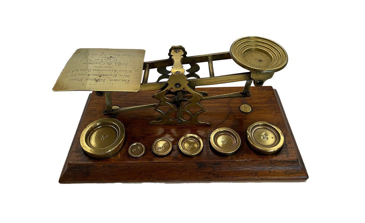 Brass scales on wooden stand including 6 weights: 1 x 8 oz (ounce); 1 x 4 oz; 1 x 2 oz; 1 x 1 oz; 1 x 1/2 oz; 1 x 1/4 oz.