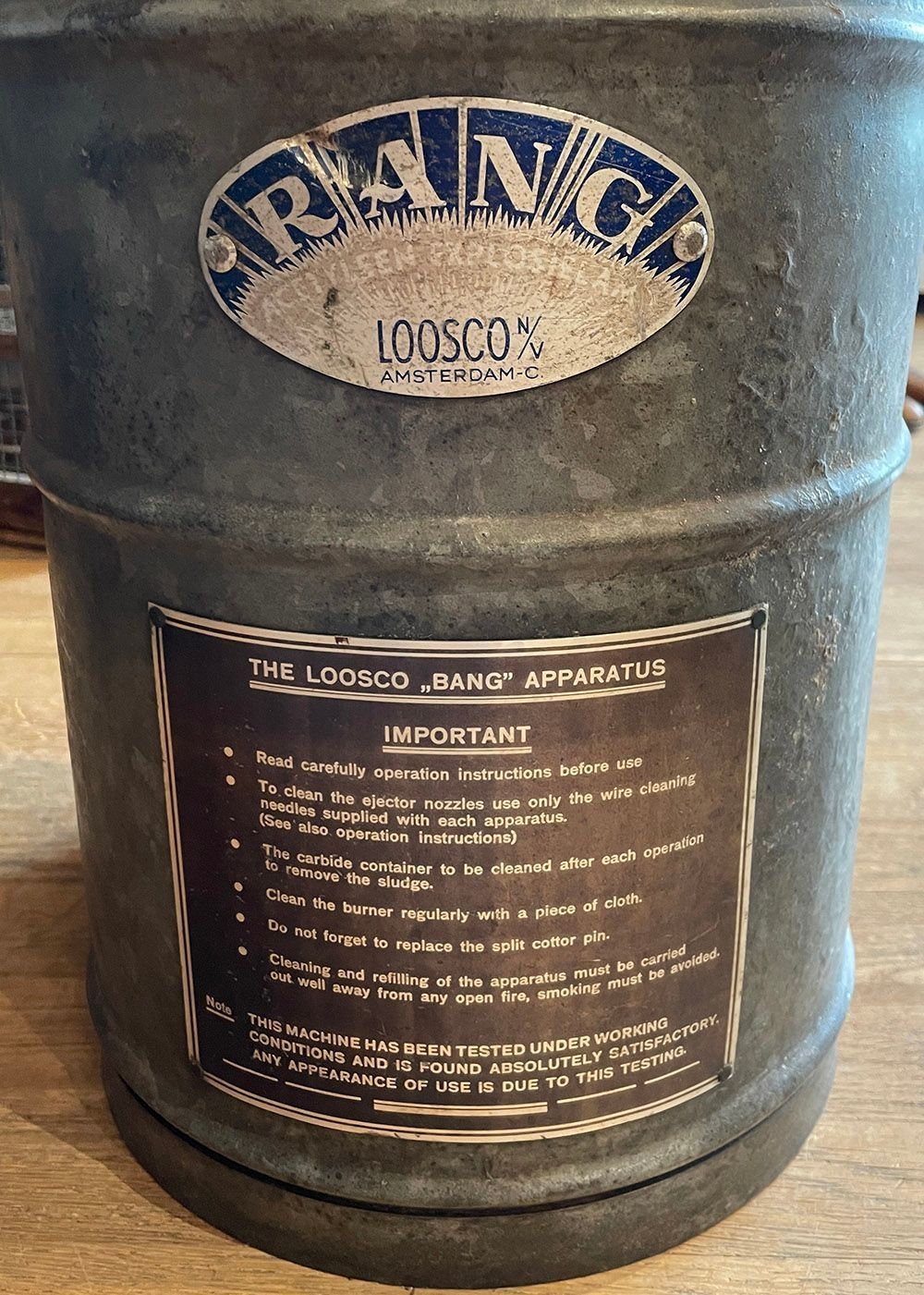 The LOOSCO "Bang' Apparatus. Important. • Read carefully operation instructions before use. • To clean the ejector nozzle use only the wire cleaning needles supplied with each apparatus (See also operating instructions). • The carbide container to be cleaned after each operation to remove the sludge. • Clean the burner regularly with a piece of cloth. • Do not forget to replace the split cottor pin. • Cleaning and refilling of the apparatus must be carried out well away from any open fire smoking must be avoided.