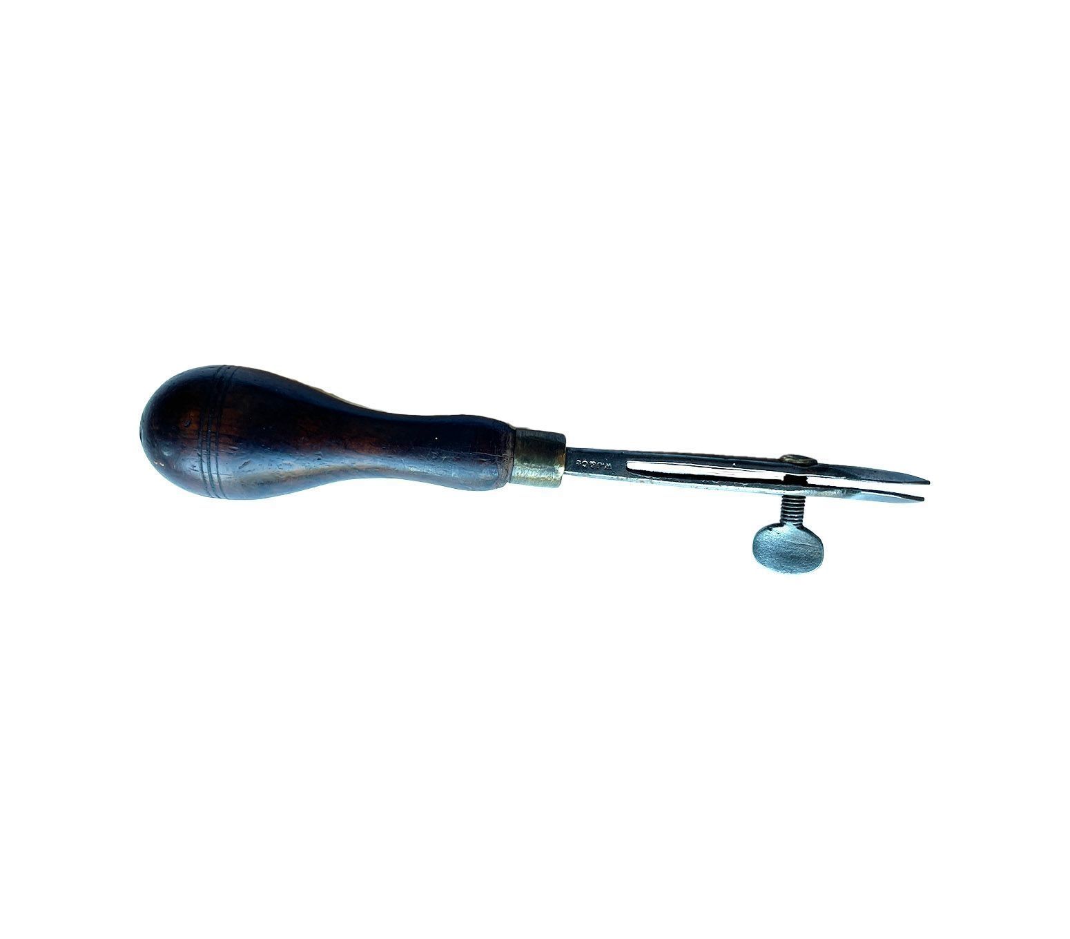 Wooden handled tool with flat split metal rod attached. The two separate plates of the rod can be adjusted - tightened or loosed. Marked on the top of the rod W J & Co.Context