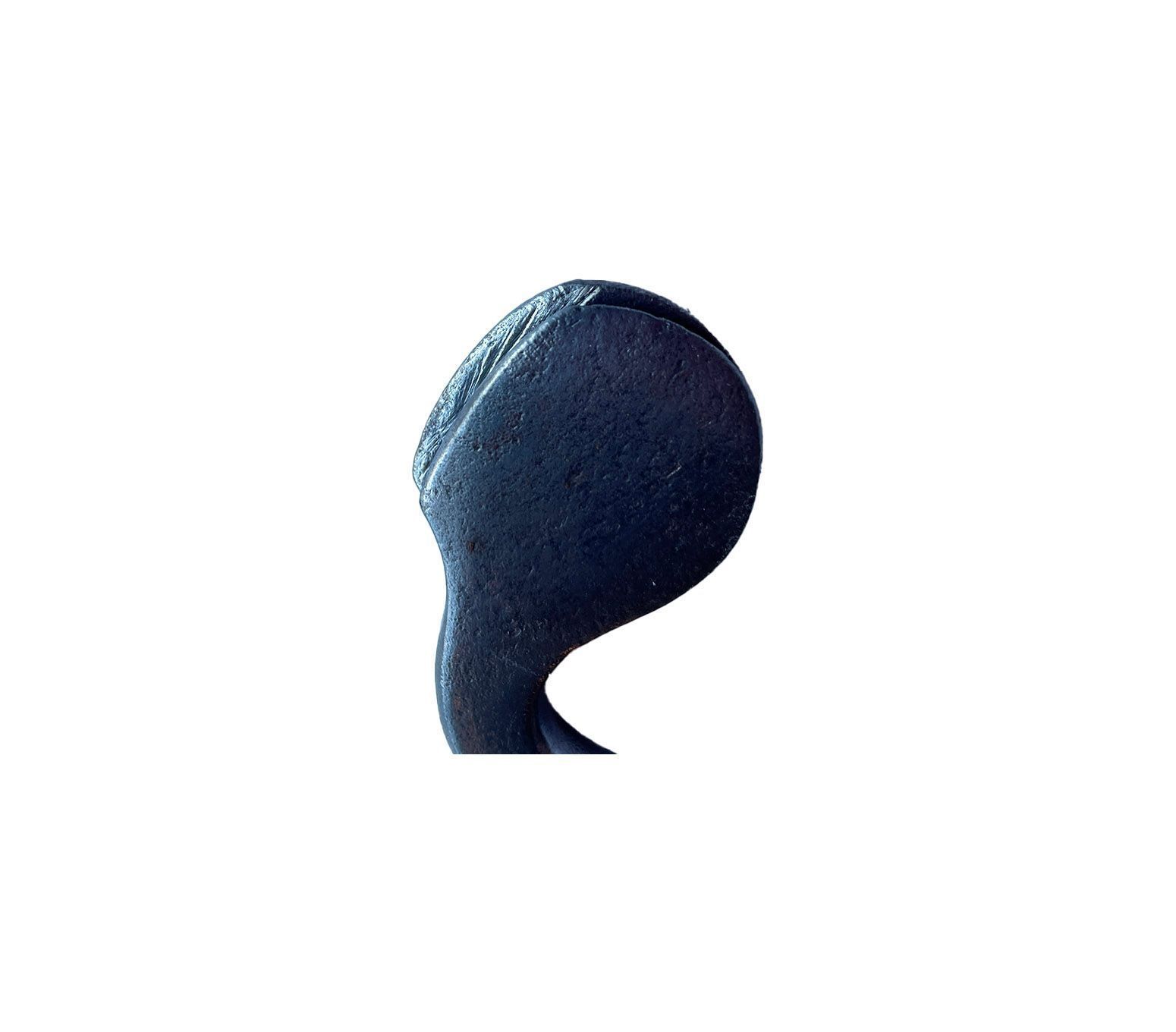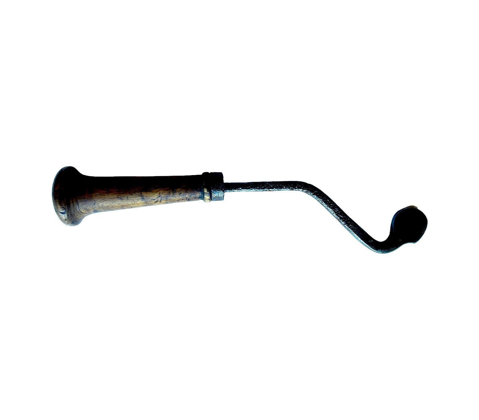 Metal curved rod on a wooden handle. The end of the curved rod has a grooved flat plate. The tool was heated up and held up to the shoulder so that pressure could be used to press down onto the leather to create the crease - one edge of the metal rest on the workbench and one on the leather.Context