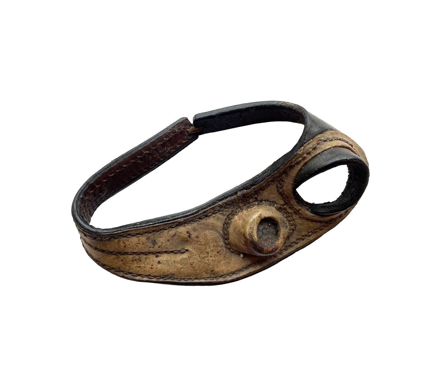 Lined leather ring with a reinforced thumb-hole and metal pad, which has a plate with a honey-comb pattern, It is onto this plate that the heel of the needle is put in order to push in through the leather.Context