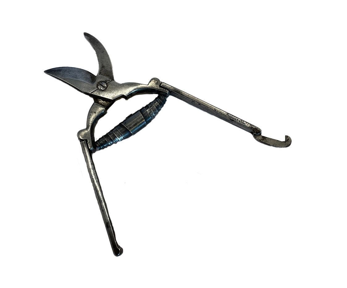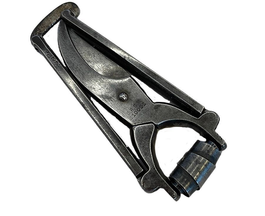Folding secateurs and suede pouch.Cataloged By