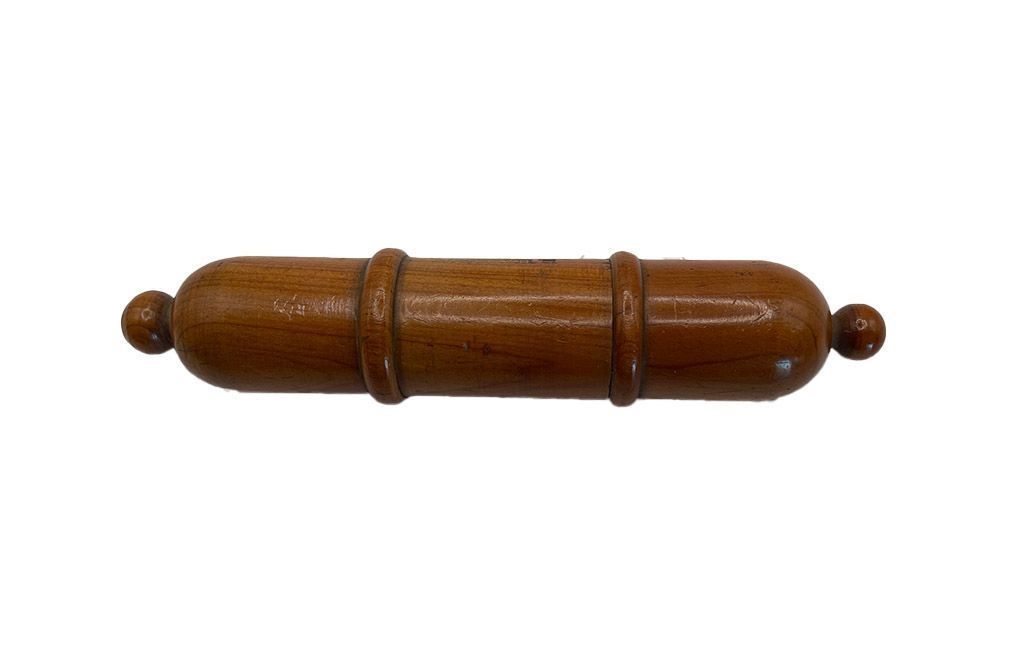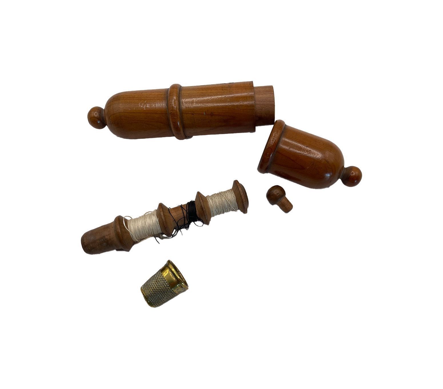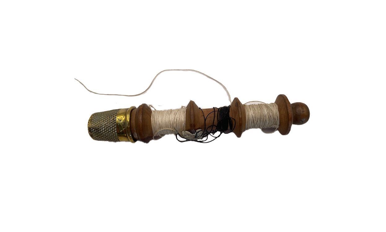 Sewing kit inside a turned wooden tube. Contains a spindle with three different colour threads, a thimble and needles inside the hollow interior. The thimble fits onto the shaped end of the spindle and the small wooden stopper plugs into the opposite end of the spindle to prevent the needles from falling out. E. Harrison i stamped on the outside of the kit.Cataloged By