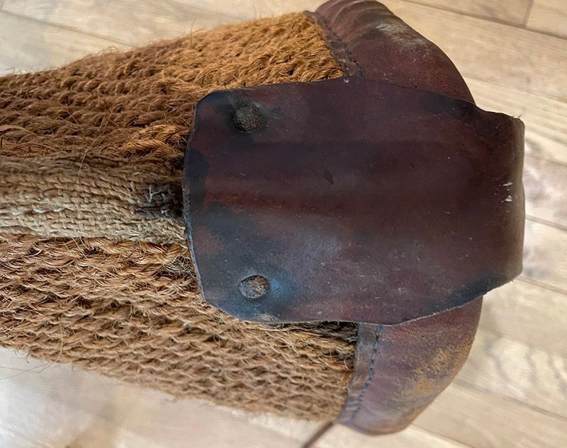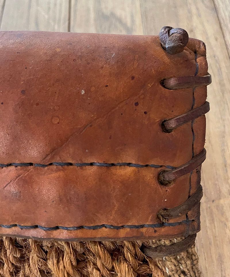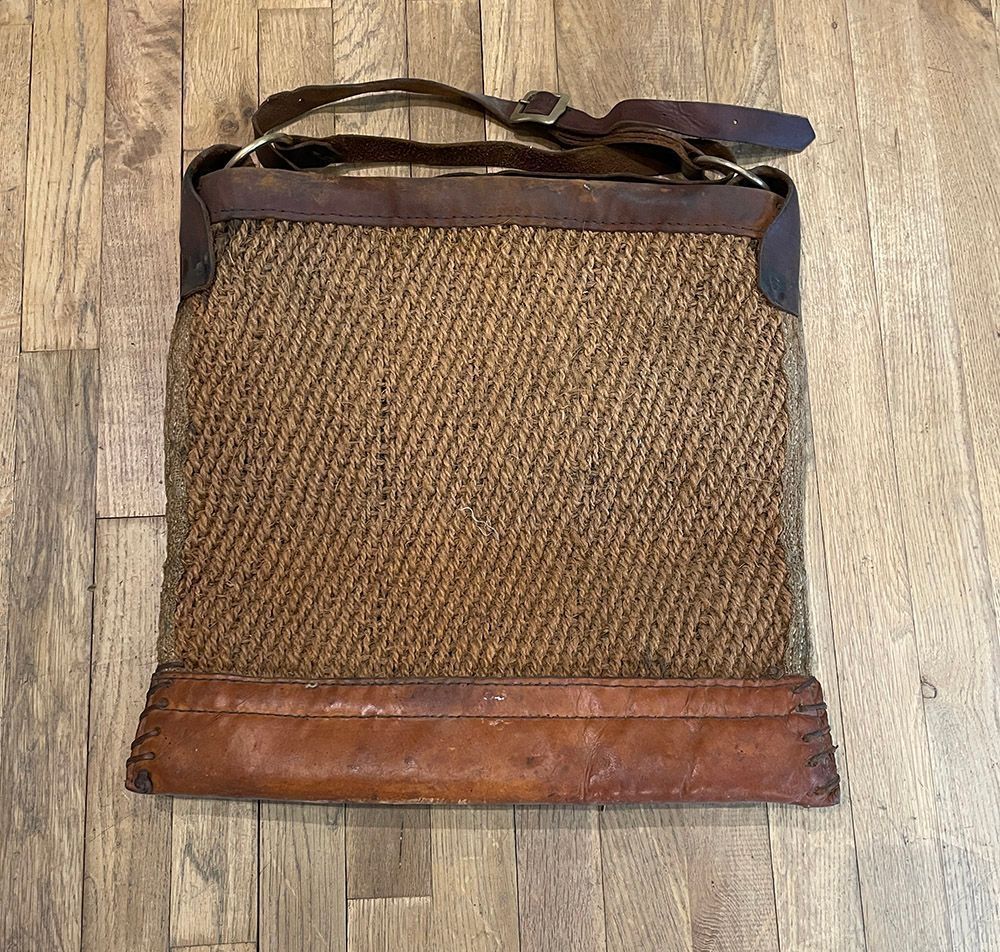 Large hessian and leather nosebag, with strap to go over horses head.Context