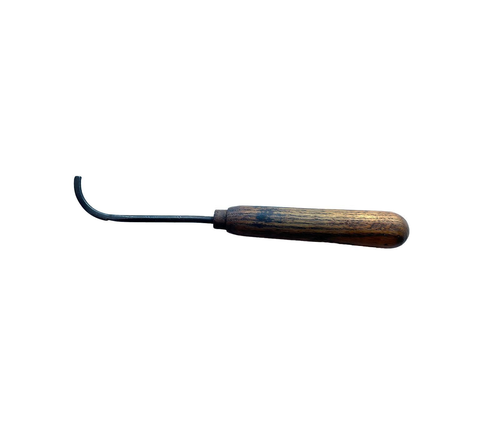 Wooden handle attached to a metal rod curved at the end and cut sheer to make a blunt end.Cataloged By