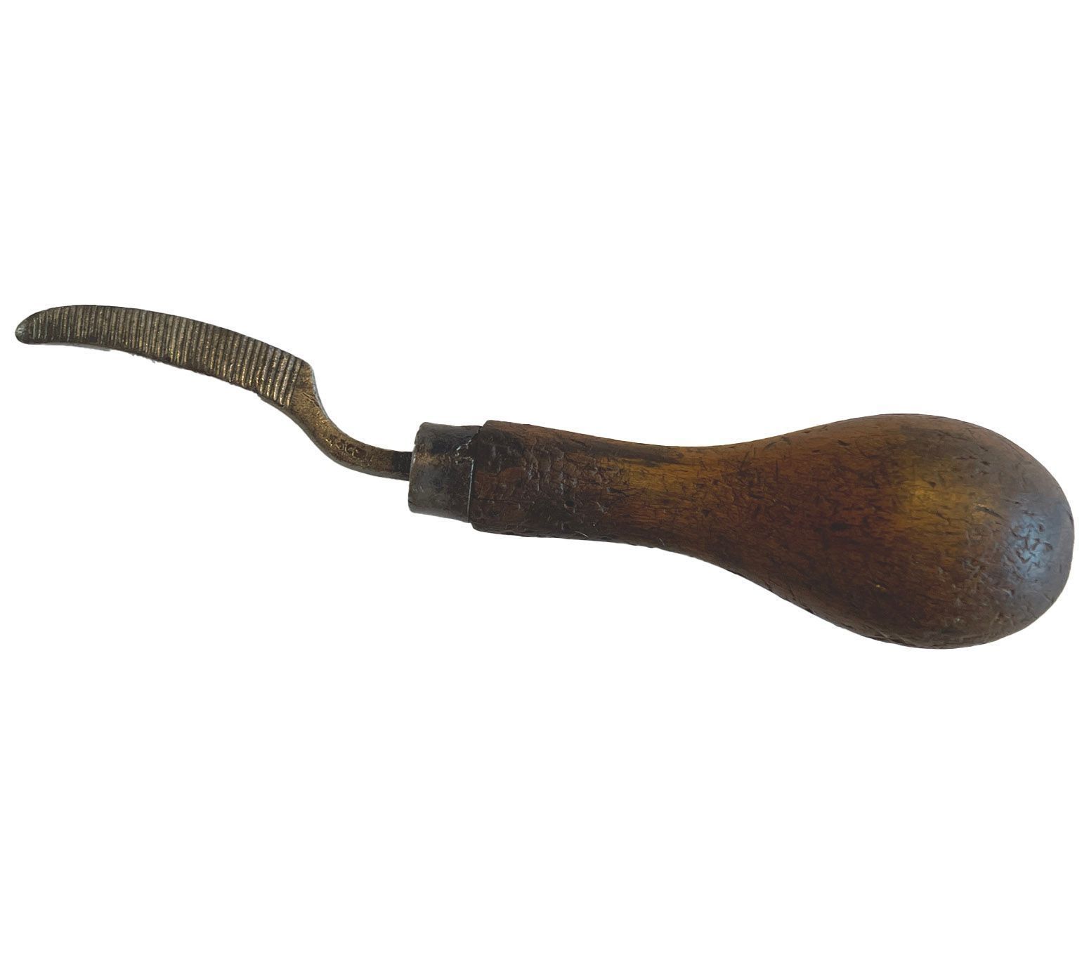 Wooden handled attached to small knife-shaped curved file, with file-cut teeth on one side only. .Cataloged By