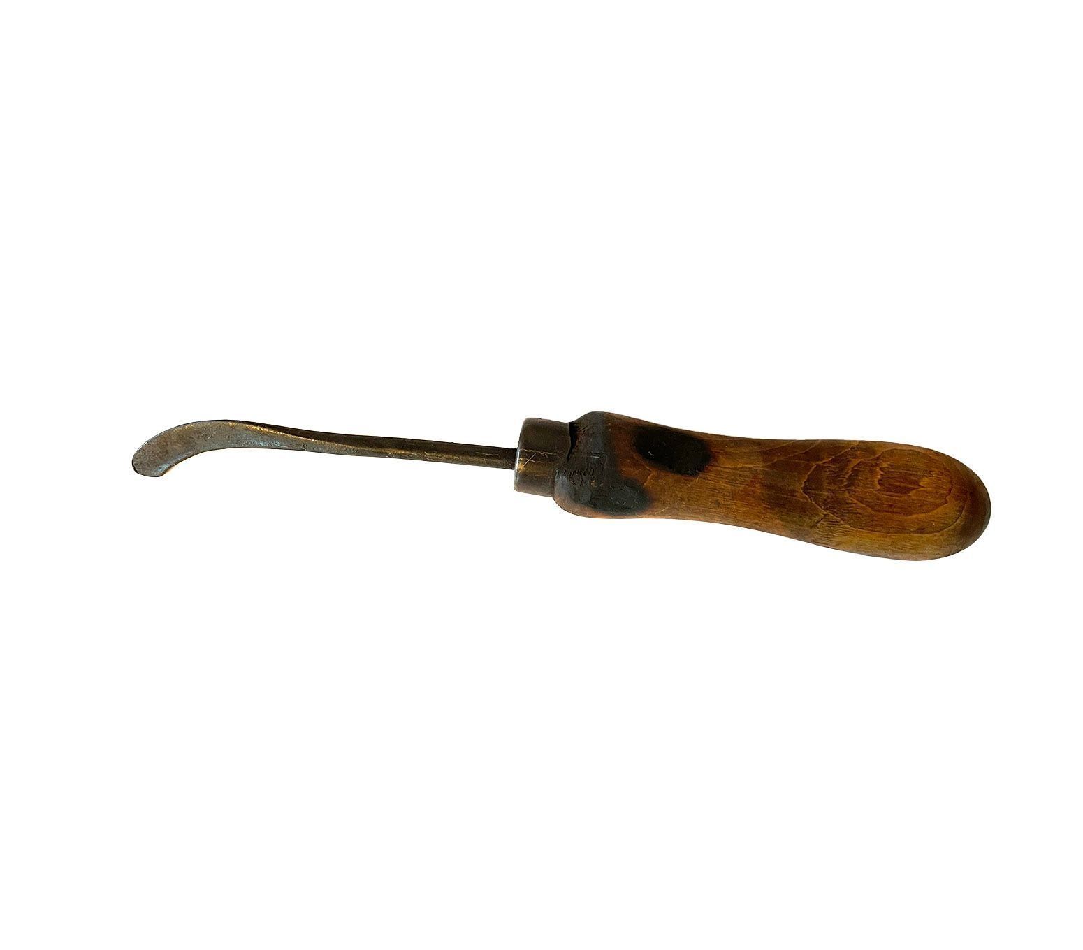 Wooden handle with a metal arm whichis curved and flattened at the end. A brass ring secures the rod to the handle.Cataloged By