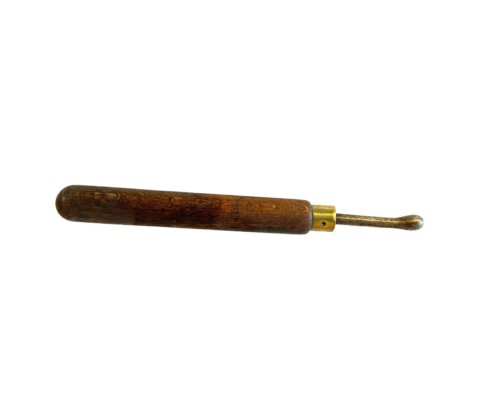 Wooden handle with short metal rod, with spherical polished ball end. The metal and wood are joined together and strengthened by a brass hoop.Cataloged By