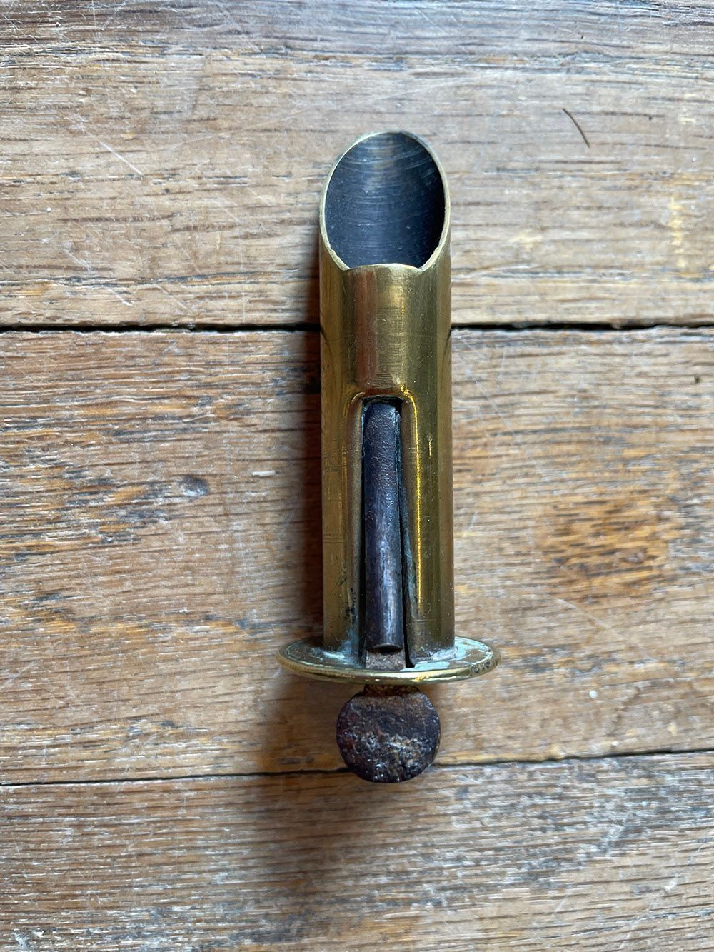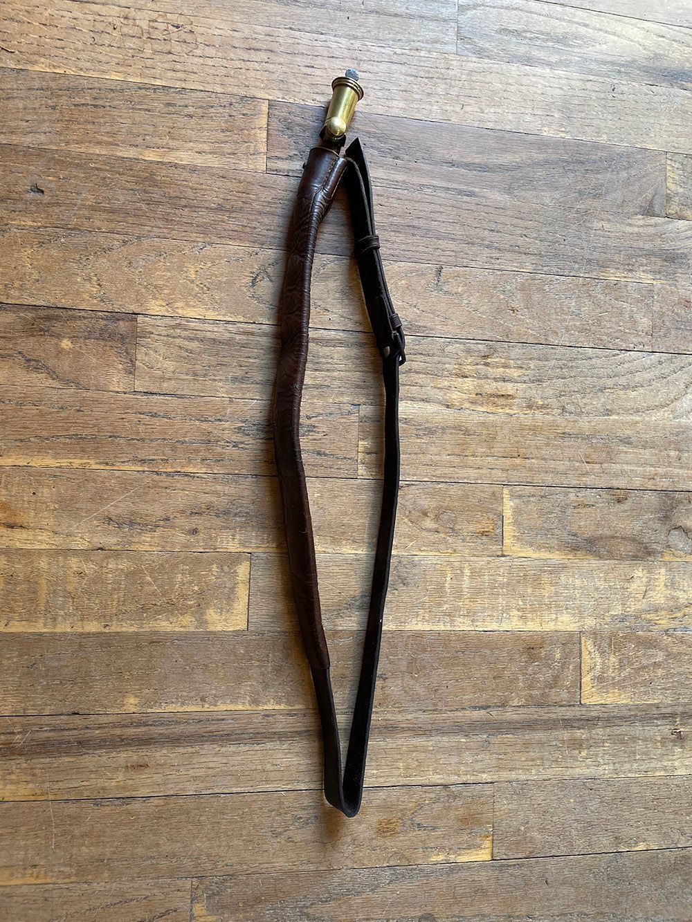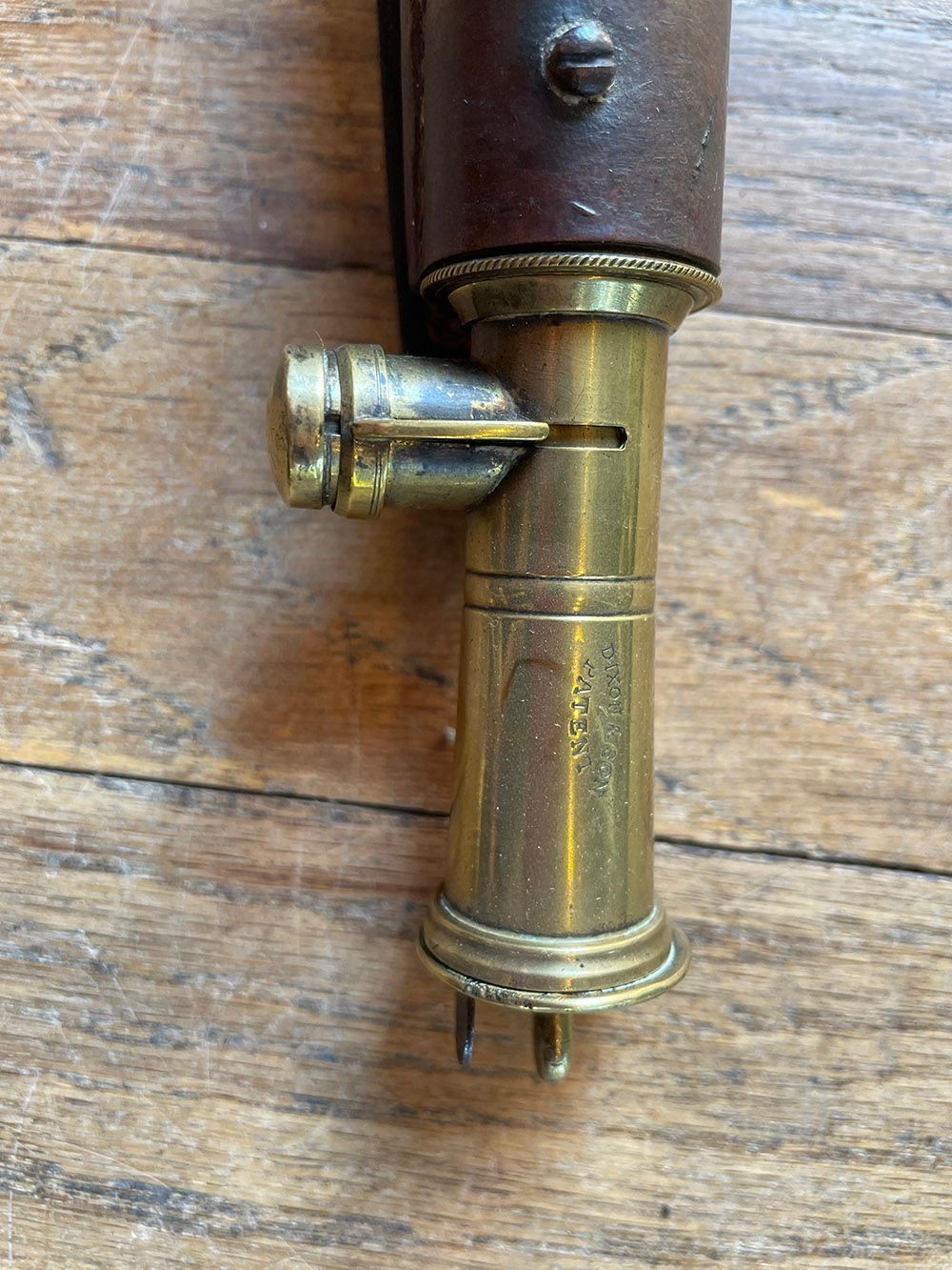 Hollow leather tube, tapering to belt with metal buckle. Brass closure to the tube with small shovel inside. Engraved Dixon & Sons Patent.Context