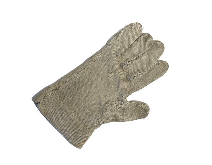 A children's glove made out of knitted silk - similar to silk stocking material, which it could be made from. Much used and mended.Context