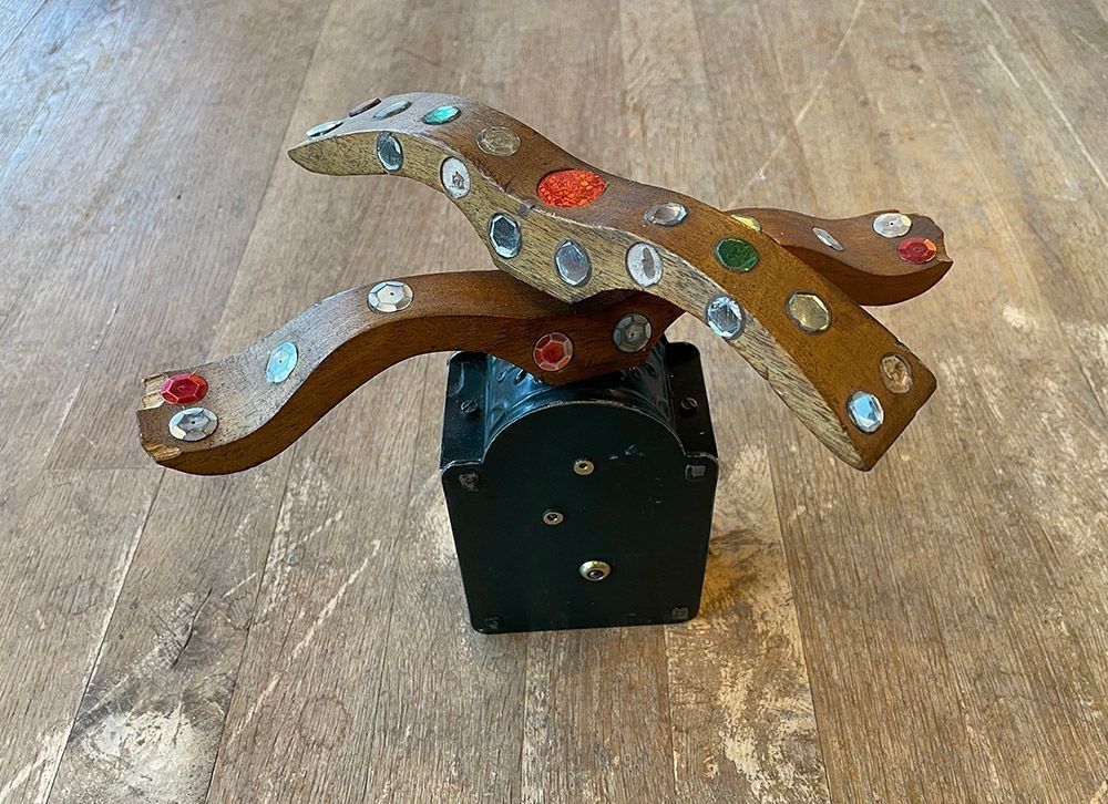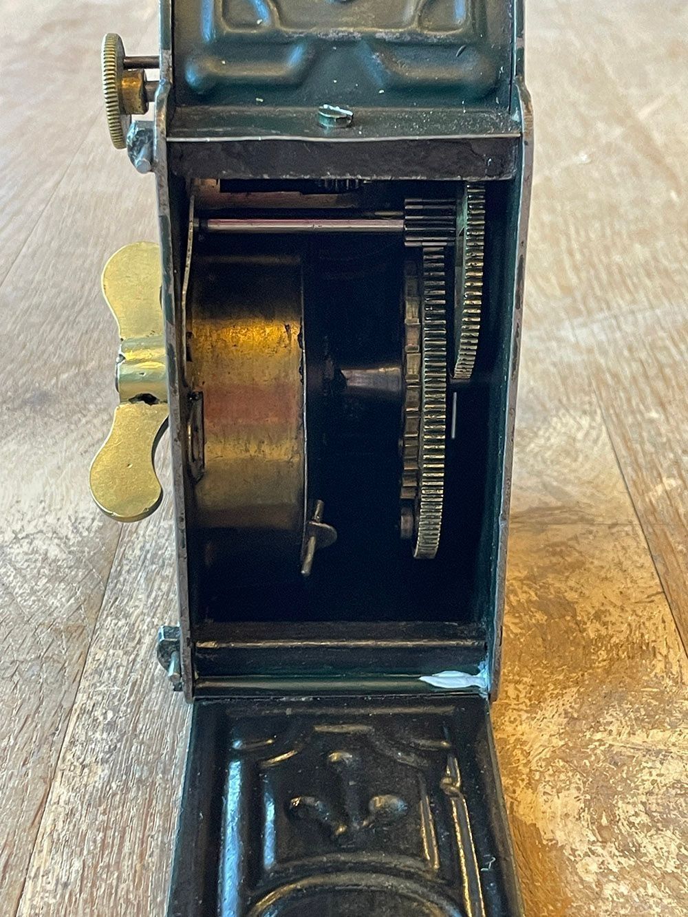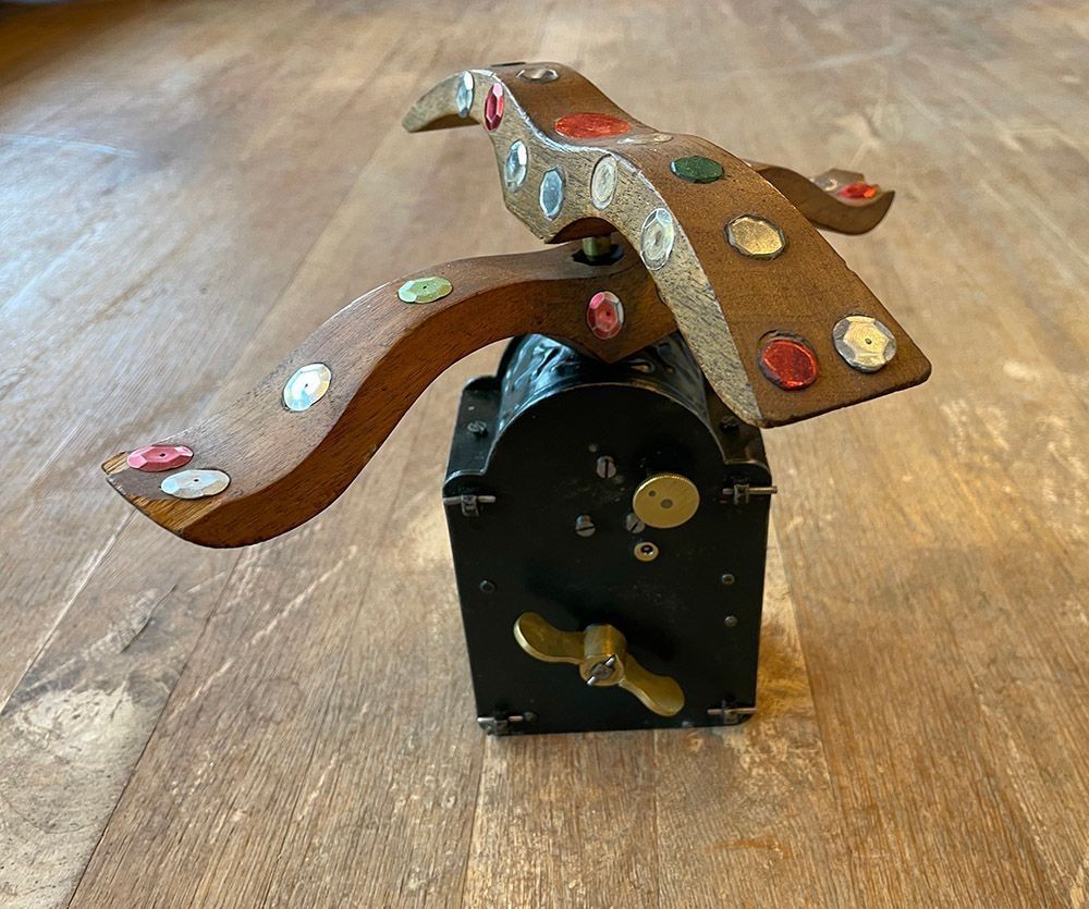 Metal box with internal brass clock works, with a brass winding key on the removable back, and two hinged side doors to gain access to the works. Above the winding key is a circular knob, which when turned stops and starts the removable revolving lure. The rotating wings, shaped like a bird's wings are inset with numerous small mirror glass pieces and where they have been lost have been replaced with sequins. When revolving these reflect the light and attract larks, who have an insatiable curiosity and attraction to anything that glitters. One wing rotates clockwise, whilst the other anti-clockwise.Context