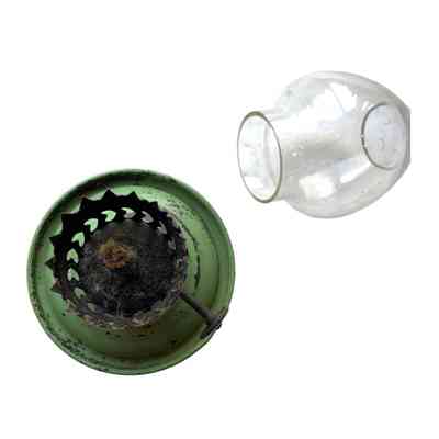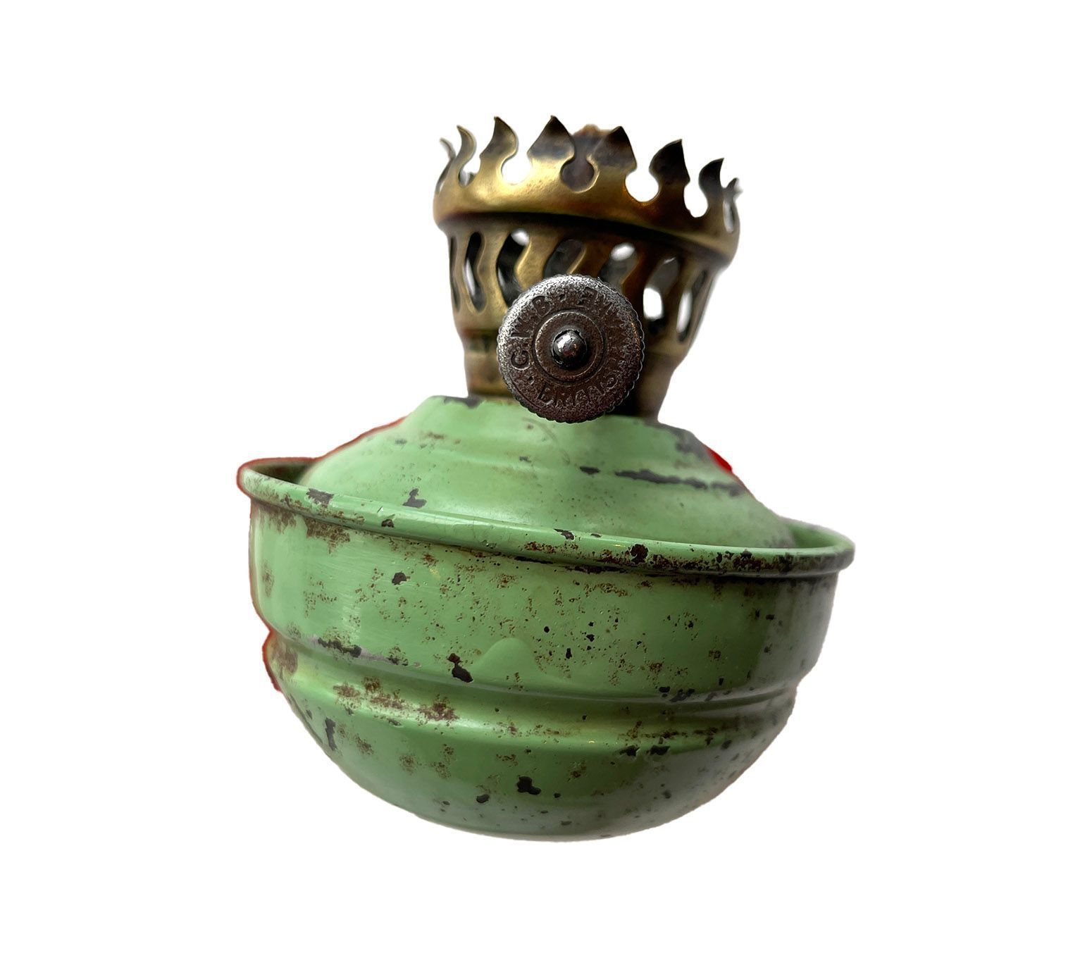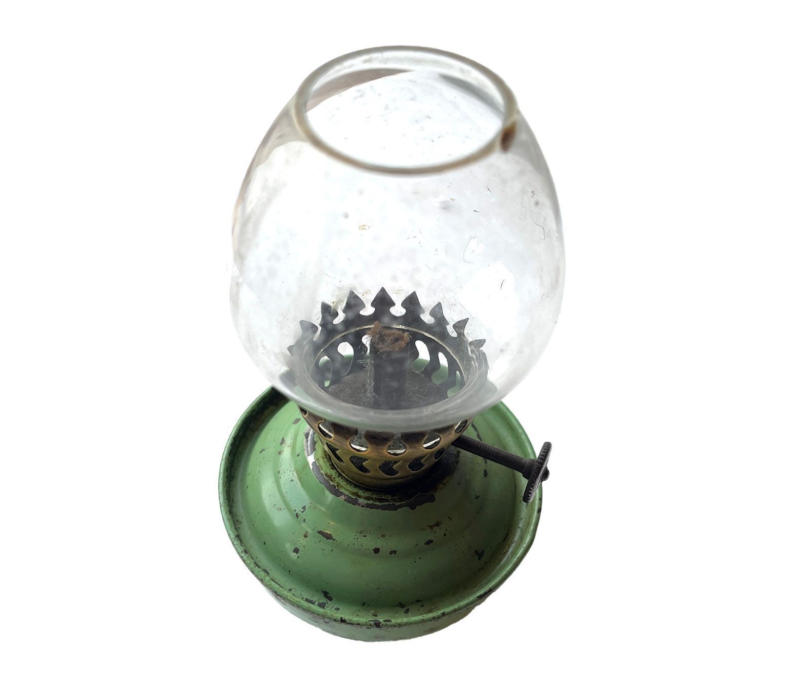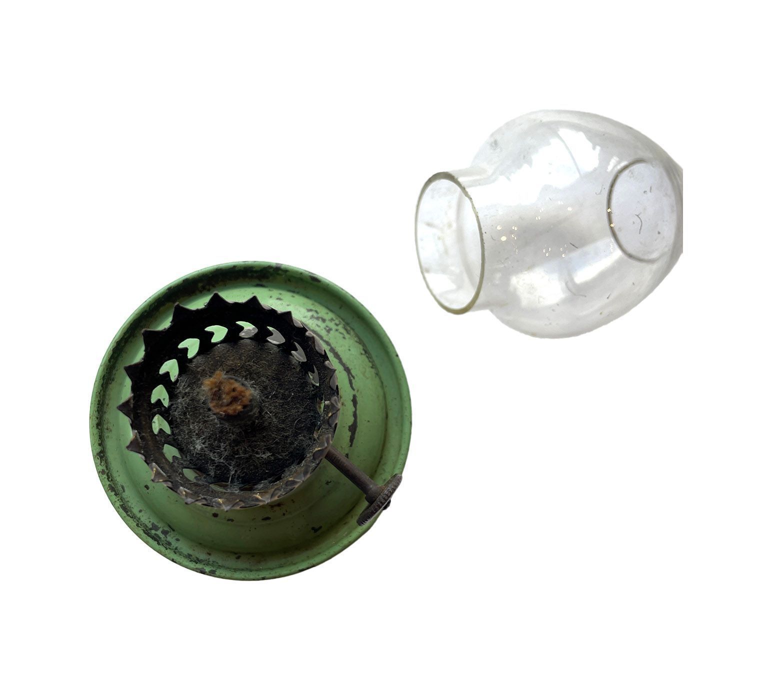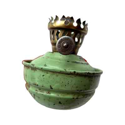 A small paraffin/kerosene weighted lamp which has an enclosed "cup" body which contains the fuel. The top wick holder, made from brass, has an extended enclosed spout which raises the wick approximately 20mm from the bottom of the holder. The wick holder screws into the top of the paraffin/kerosene reservoir bowl and has a wick adjustment screw (light control) at the side. The small clear glass light reflector bulb nestles securely onto the wick holder and is kept snug by snap designed extending "fingers". The section between the bottom of the refractive glass "light" bowl and the top of the kerosene bowl has perforations to allow air passage to feed directly to the wick.The light refracting bulb is open at the top to allow heat and smoke from the burning wick to escape upwards. The weighted base was to ensure that it would not be knocked over.Cataloged By