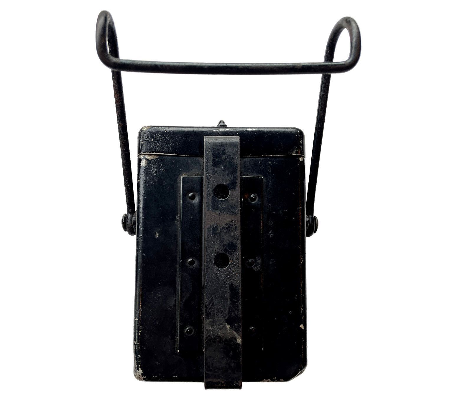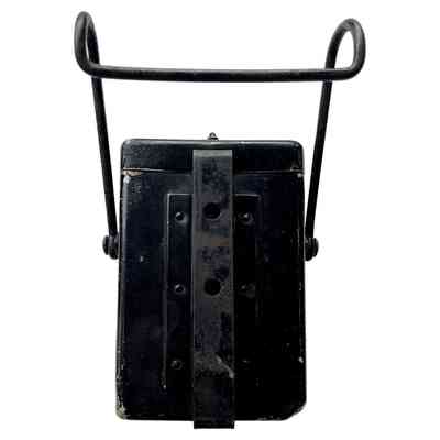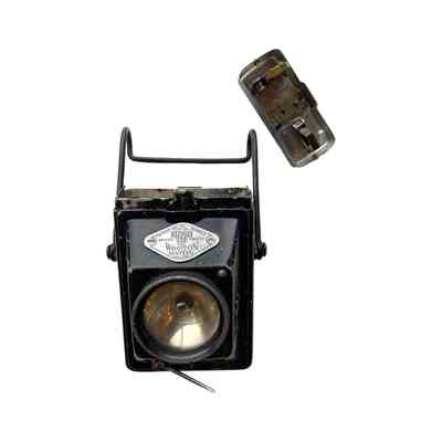 A Vintage 1930's Police lamp known as The Wootton Lantern. It is a 2 volt electric lamp accumulator which came into use in 1920. Rectangular in shape the lamp is painted black and has two wire carrying handles and a large clip for attachment to a belt. The really clever bit is the knurled ring which, when rotated, moved the reflector and will focus the bulb for extra range.This is what the patent is for.Context