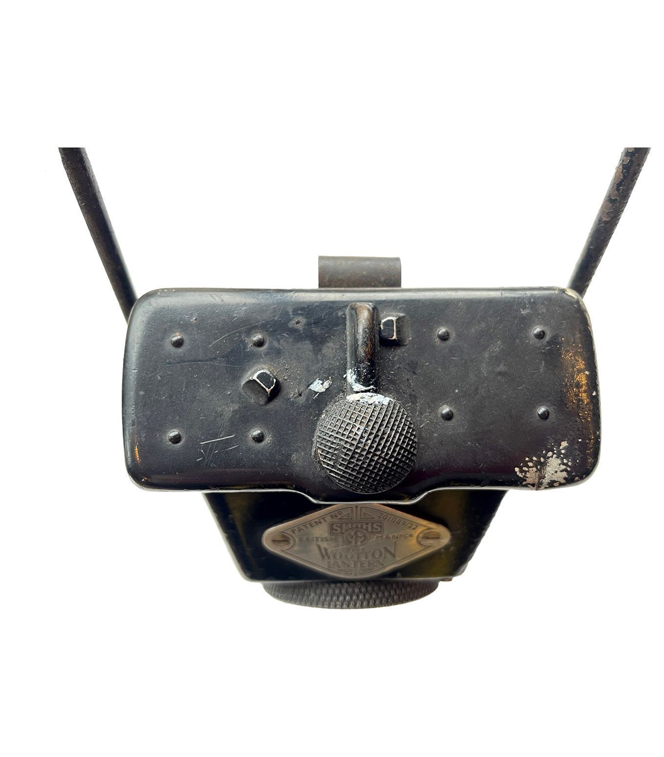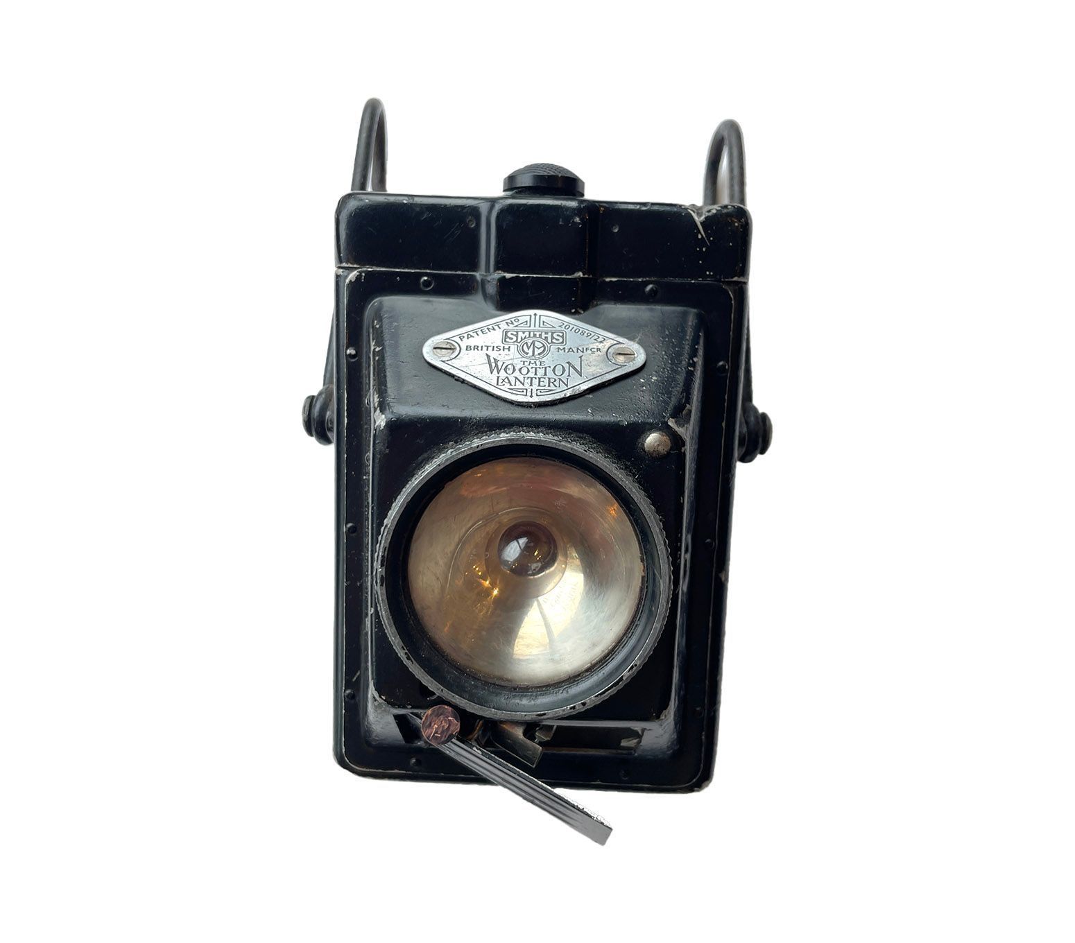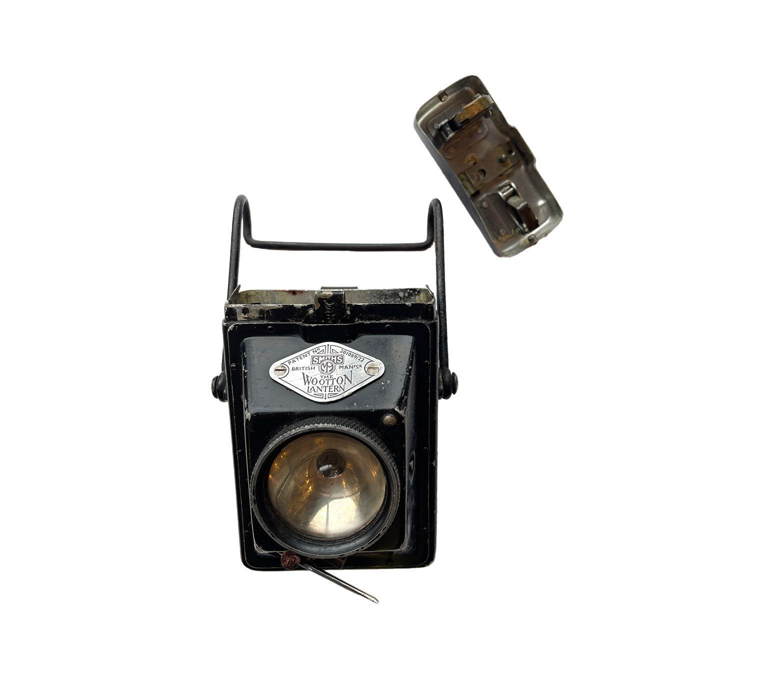 The lamp itself was designed by George Arthur Henry Wootton who was the Assistant (Chief) Engineer of the Metropolitan Police in the 1920s. The patent carries the date of 23rd November, 1922. The manufacturer of these lamps, Smith’s and Son was situated in Cricklewood. The top is released by pushing a button on the side, see one of the photographs. On the top is a rotating on off switch which operates smoothly. There is a compartment in the front under the lens which holds a spare bulb, which is present. The light can be focused by twisting the lens cover on the front, this rotates as it should and the lenses moves forward and back to focus as it should.Cataloged By