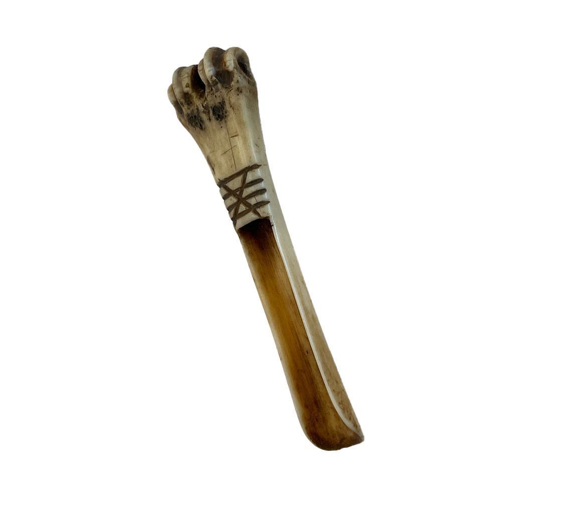 Part of a shank bone of a sheep carved into a long spoon at one end and a scratcher at the other.Acquisition