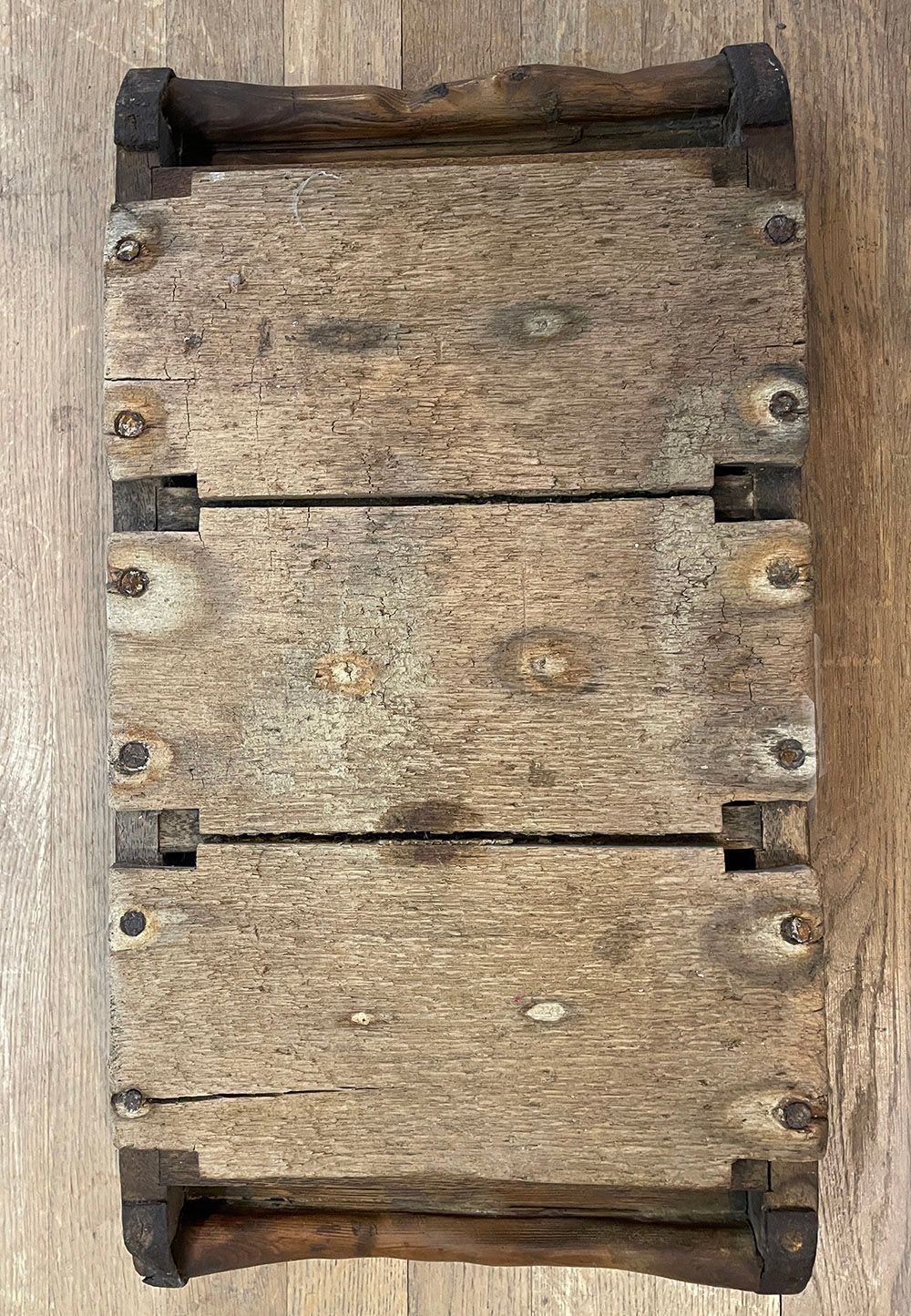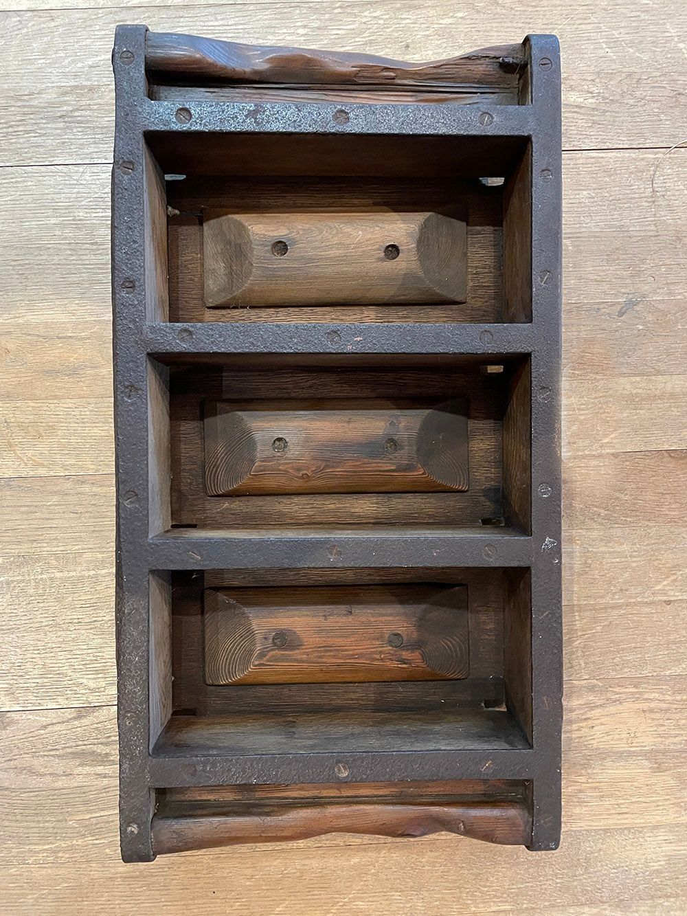 Wood with iron frame brick mould. Two handles made from branch wood.Context
